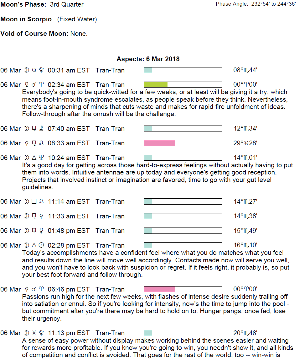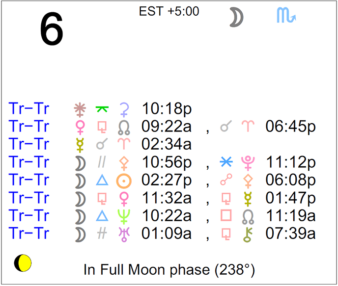 Planet Color Key: The longer the bar, the slower the aspecting planet and the longer the duration of the planet’s transit.
