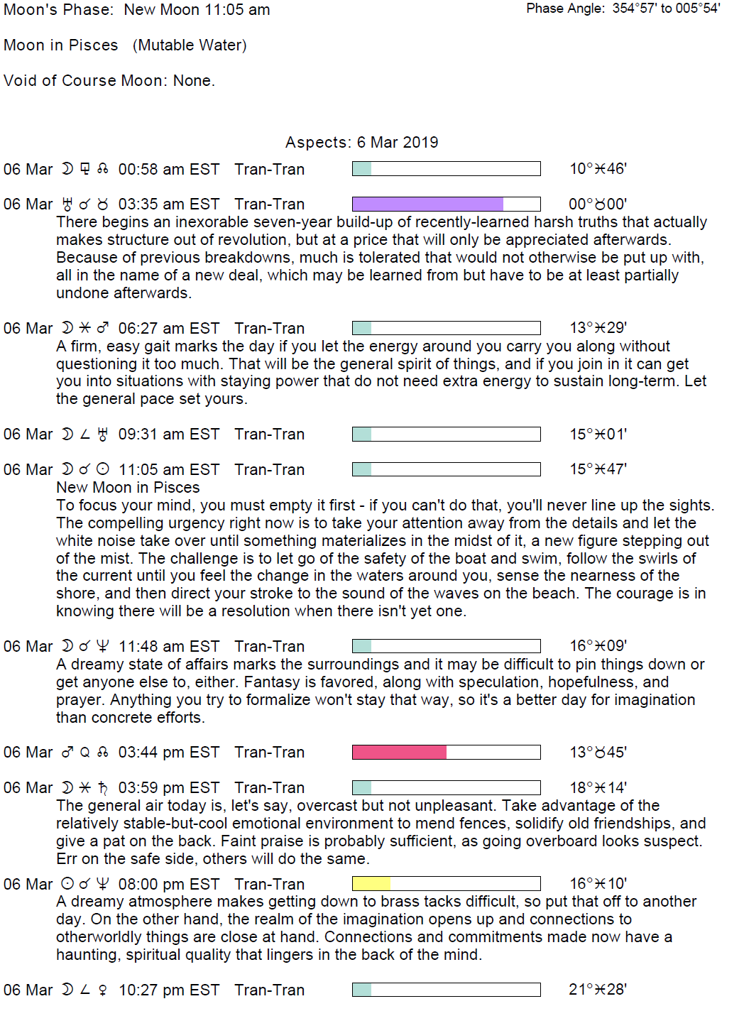 Planet Color Key: The longer the bar, the slower the aspecting planet and the longer the duration of the planet’s transit.