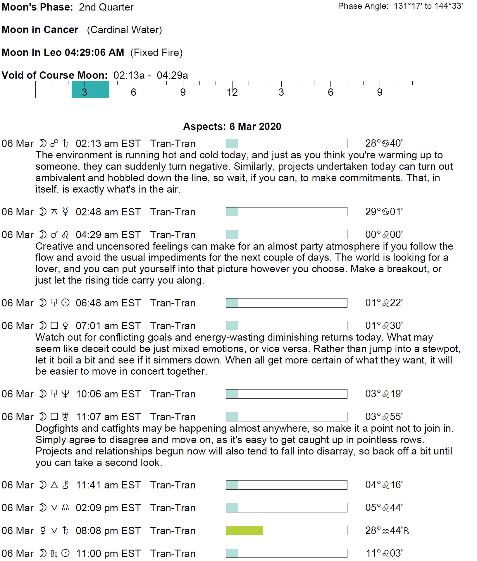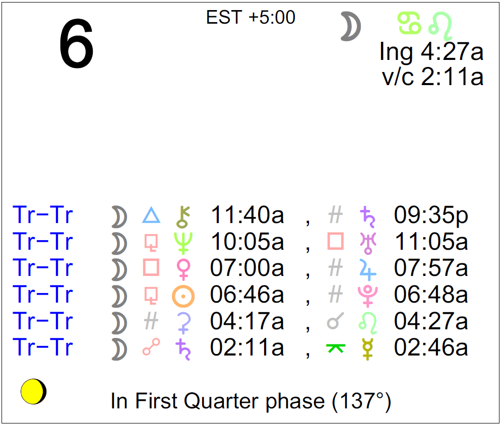 Planet Color Key: The longer the bar, the slower the aspecting planet and the longer the duration of the planet’s transit.