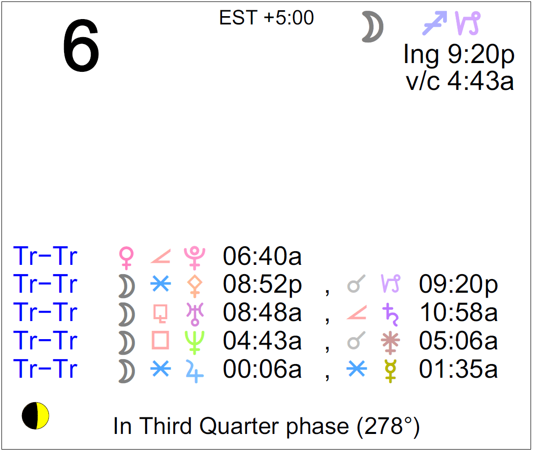 Planet Color Key: The longer the bar, the slower the aspecting planet, and the longer the duration of the planet’s transit.