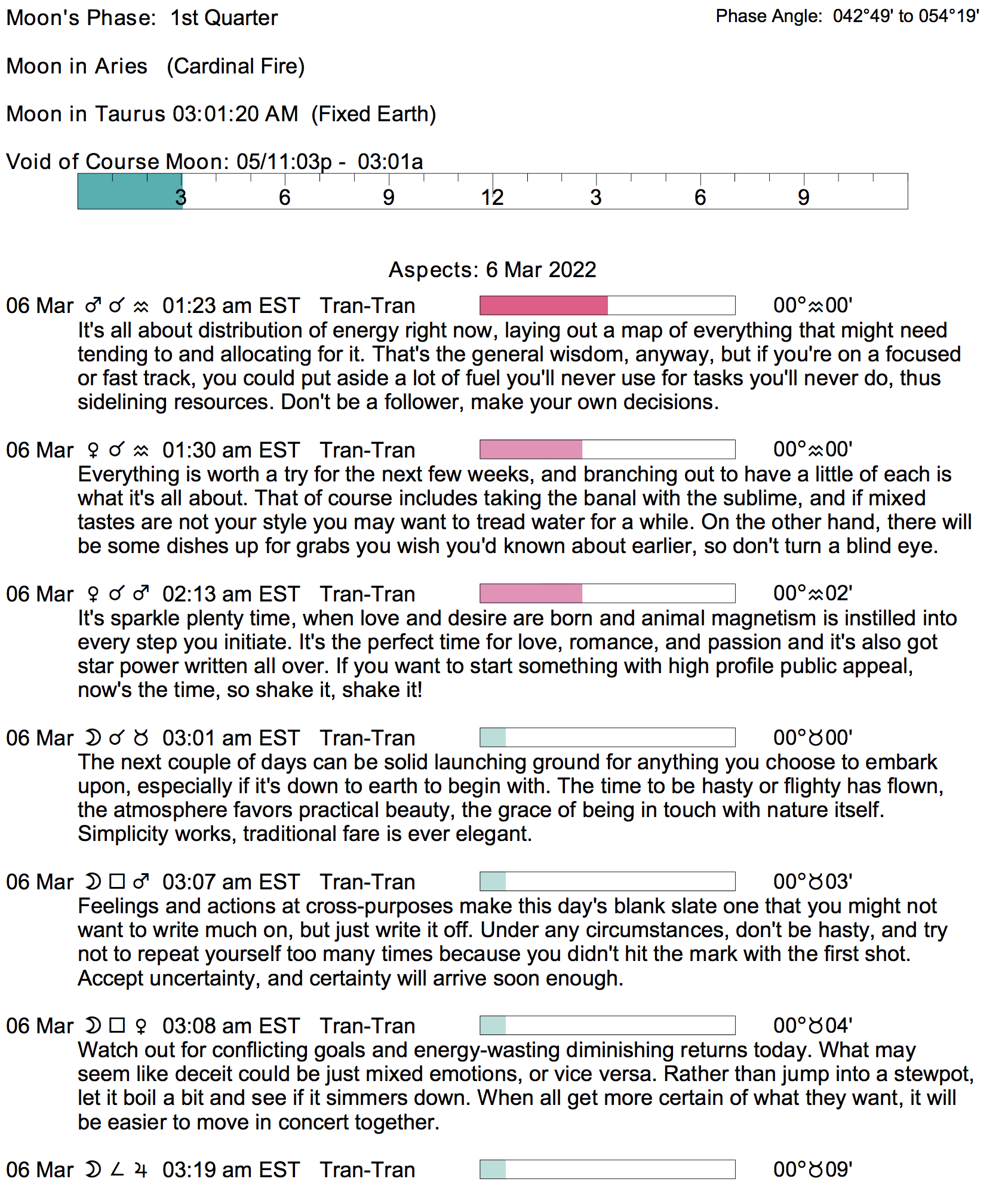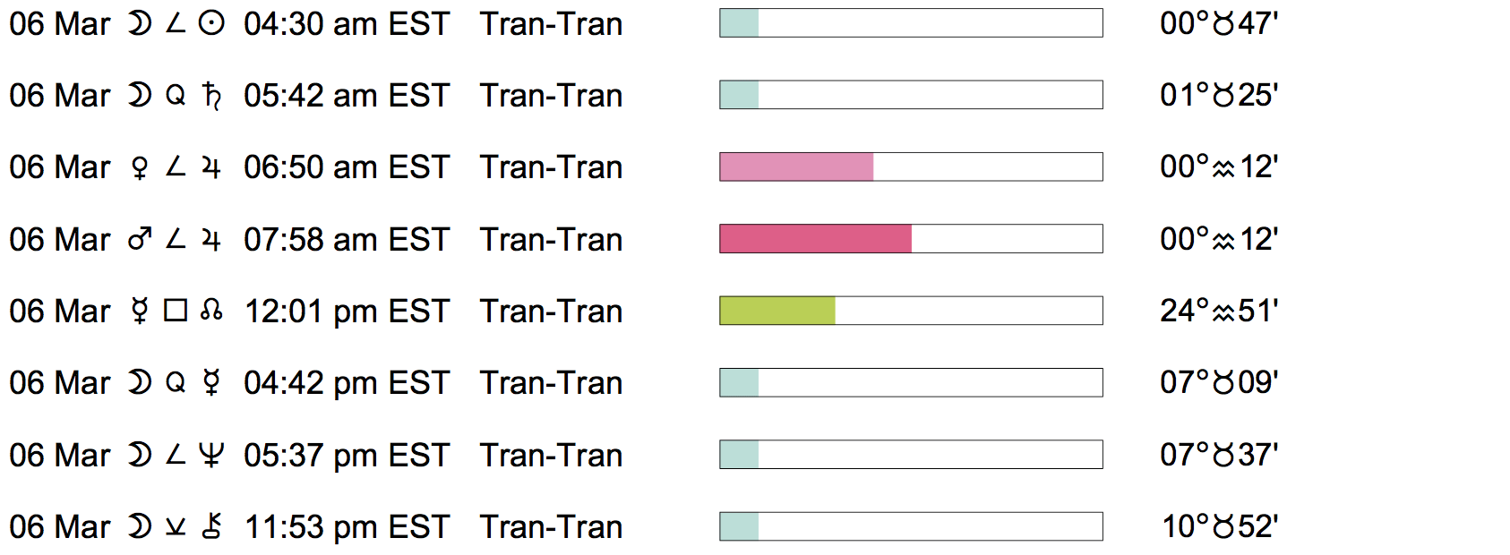 Planet Color Key: The longer the bar, the slower the aspecting planet, and the longer the duration of the planet’s transit.