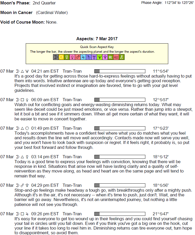 - The Moon is in Cancer all day (until Wednesday, March 8th, at 11:45 AM).