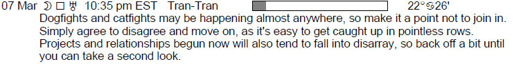 There may be sudden, minor changes to plans, schedules. There can be rebelliousness and tension. Aim to be open to possibilities, and avoid making permanent decisions.