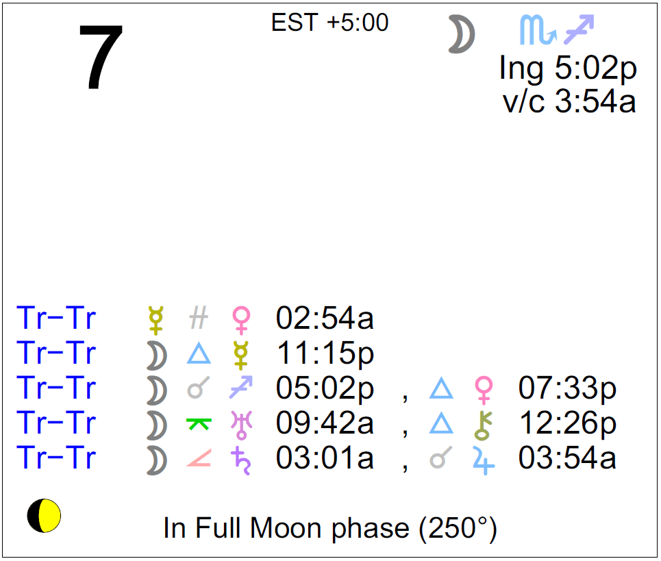 Note that the Moon moves at a rate of approximately one degree every 2 hours so that if an aspect involving the Moon is applying and has an orb of 5 degrees, the aspect will perfect (be exact) in about 10 hours. If the Moon is separating from an aspect with an orb of 2 degrees, it has already formed said aspect approximately 4 hours ago (since the following are positions at noon today, then it would have occurred at about 8 AM today).