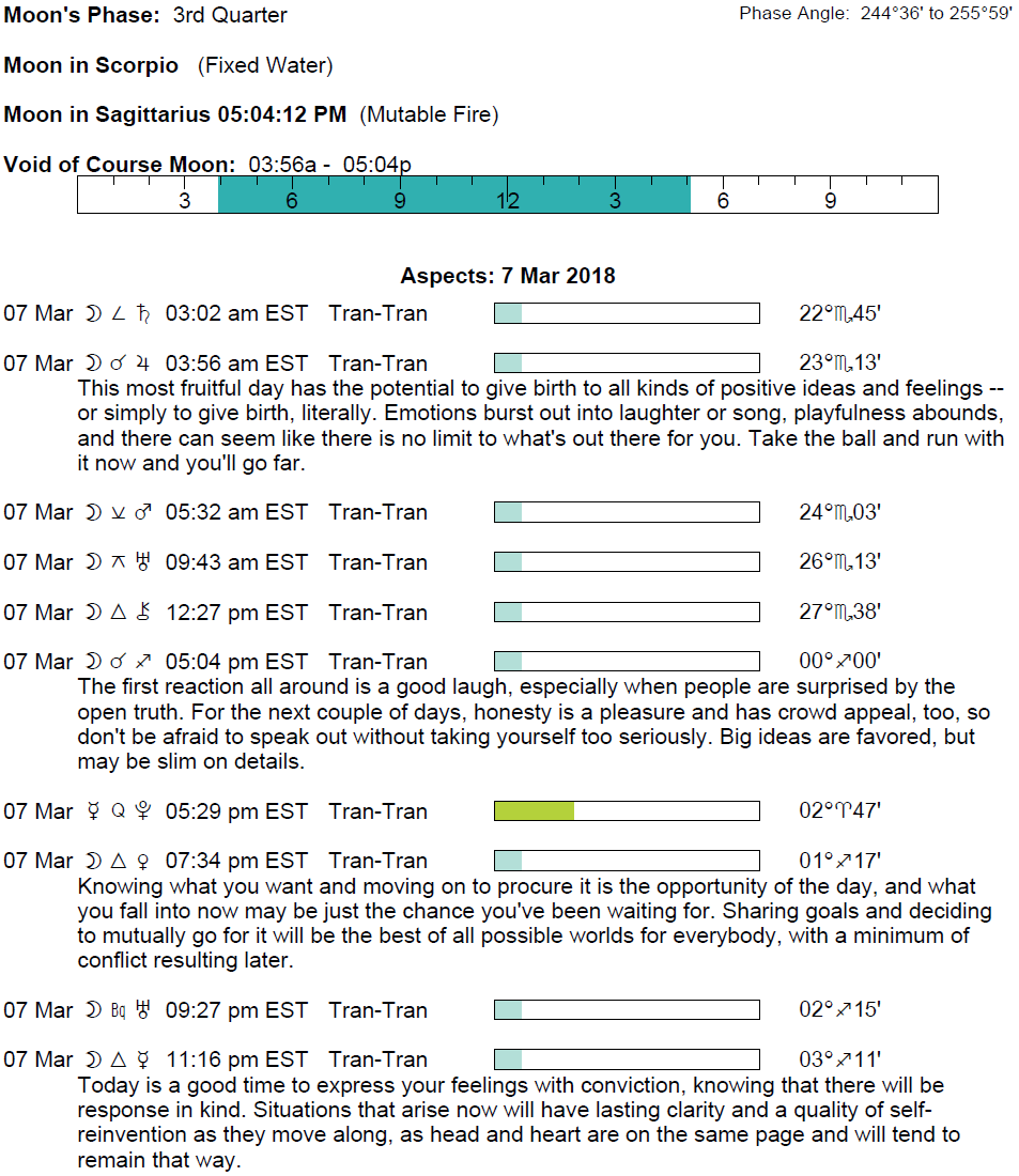 The following aspects (major only) and positions are at noon (EST) on March 7th: