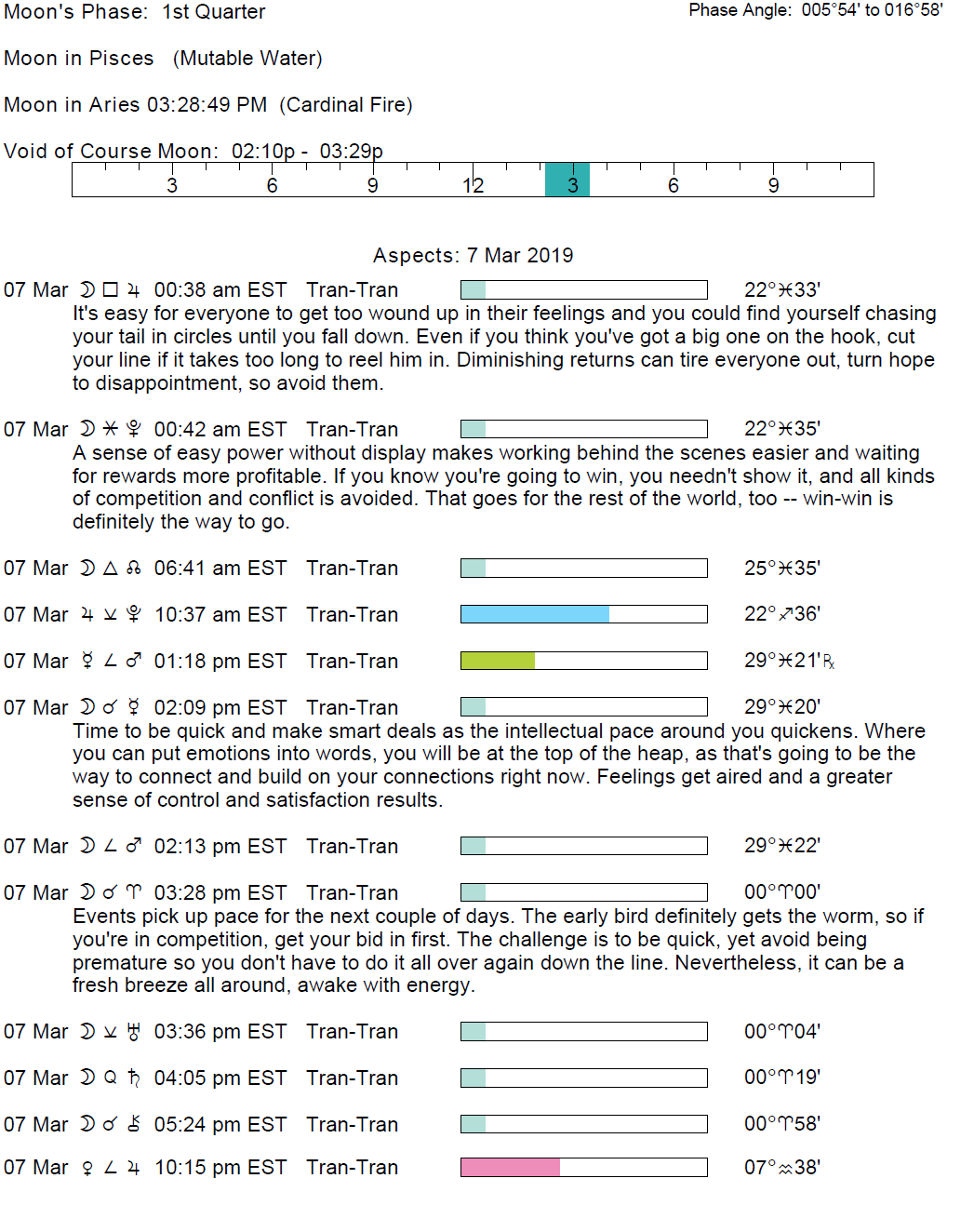 Planet Color Key: The longer the bar, the slower the aspecting planet and the longer the duration of the planet’s transit.