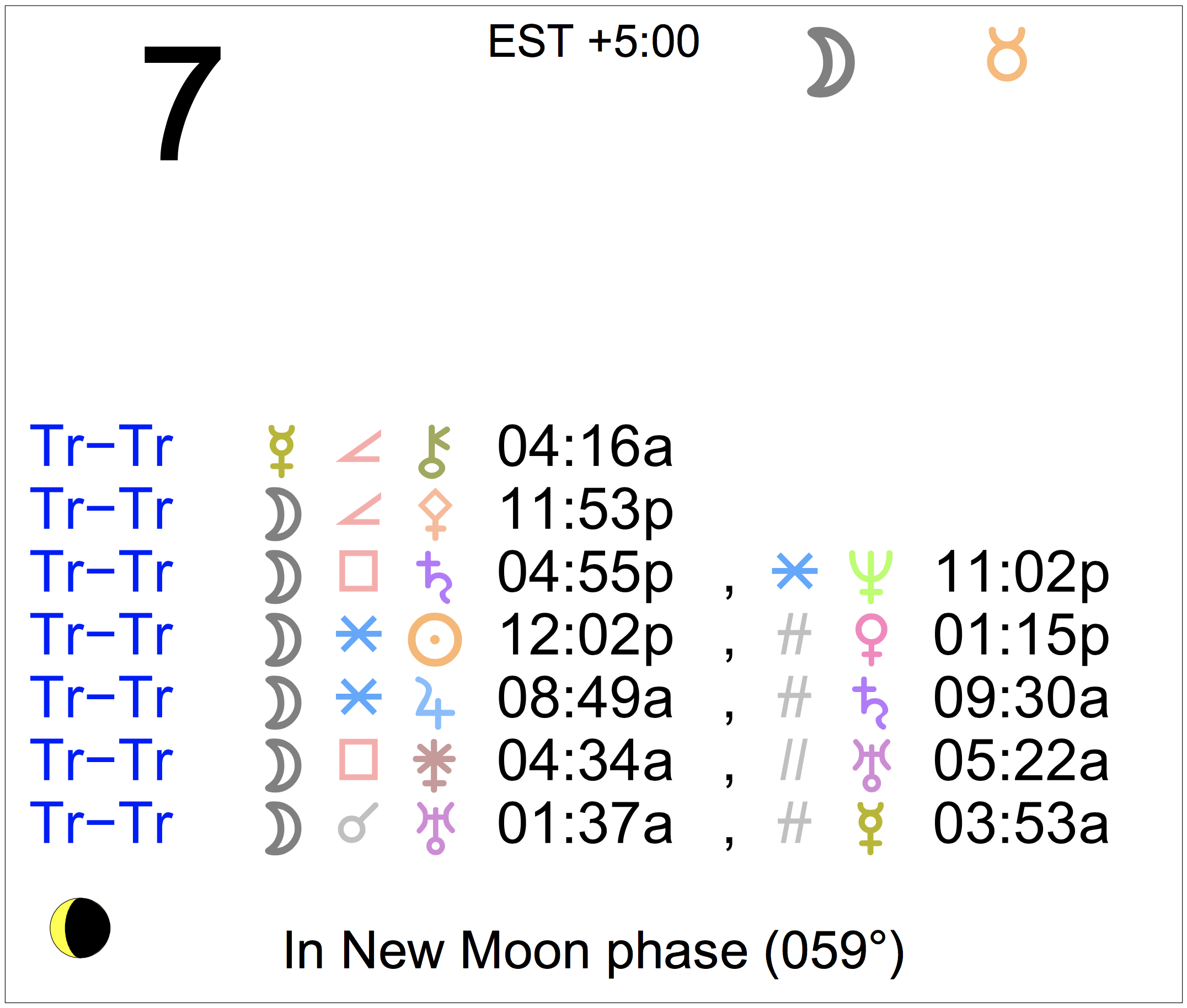 Planet Color Key: The longer the bar, the slower the aspecting planet, and the longer the duration of the planet’s transit.