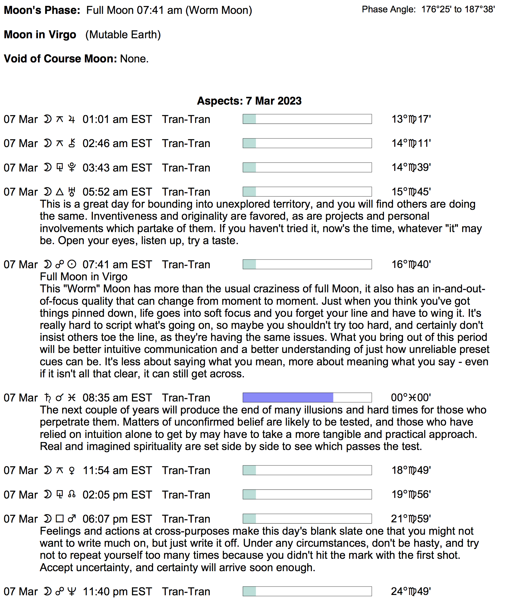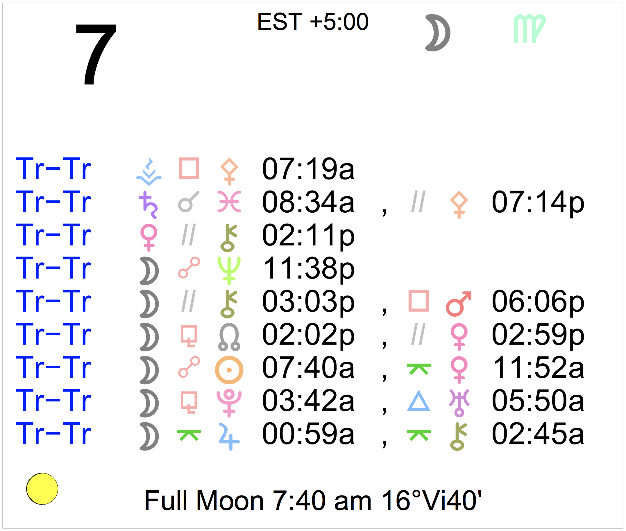 Planet Color Key: The longer the bar, the slower the aspecting planet, and the longer the duration of the planet’s transit.