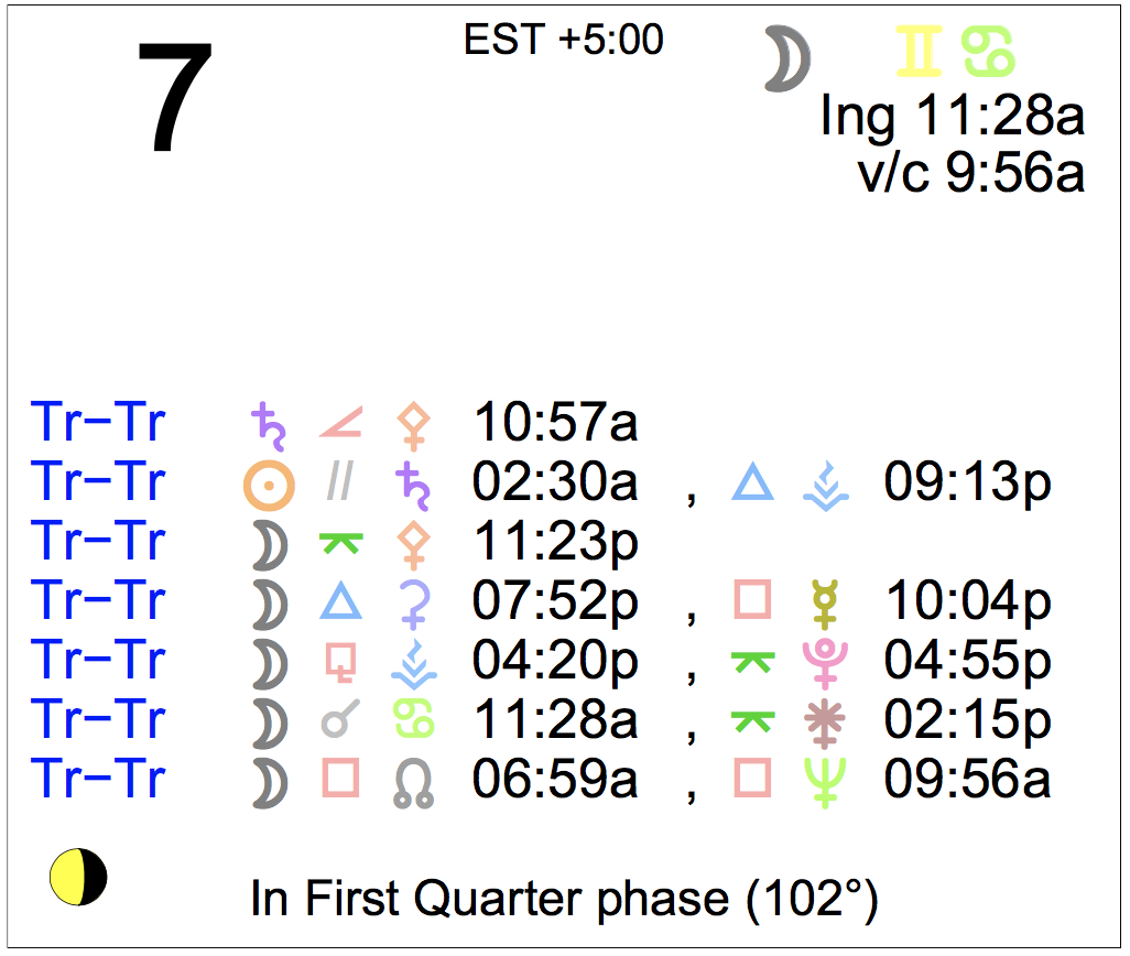 Planet Color Key: The longer the bar, the slower the aspecting planet, and the longer the duration of the planet’s transit.
