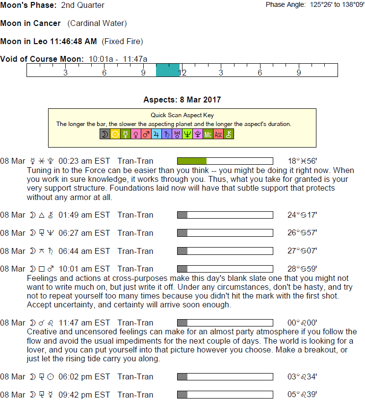 The following aspects (major only) and positions are at noon (EST) on March 8th: