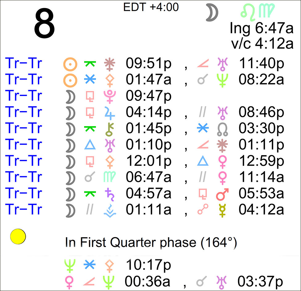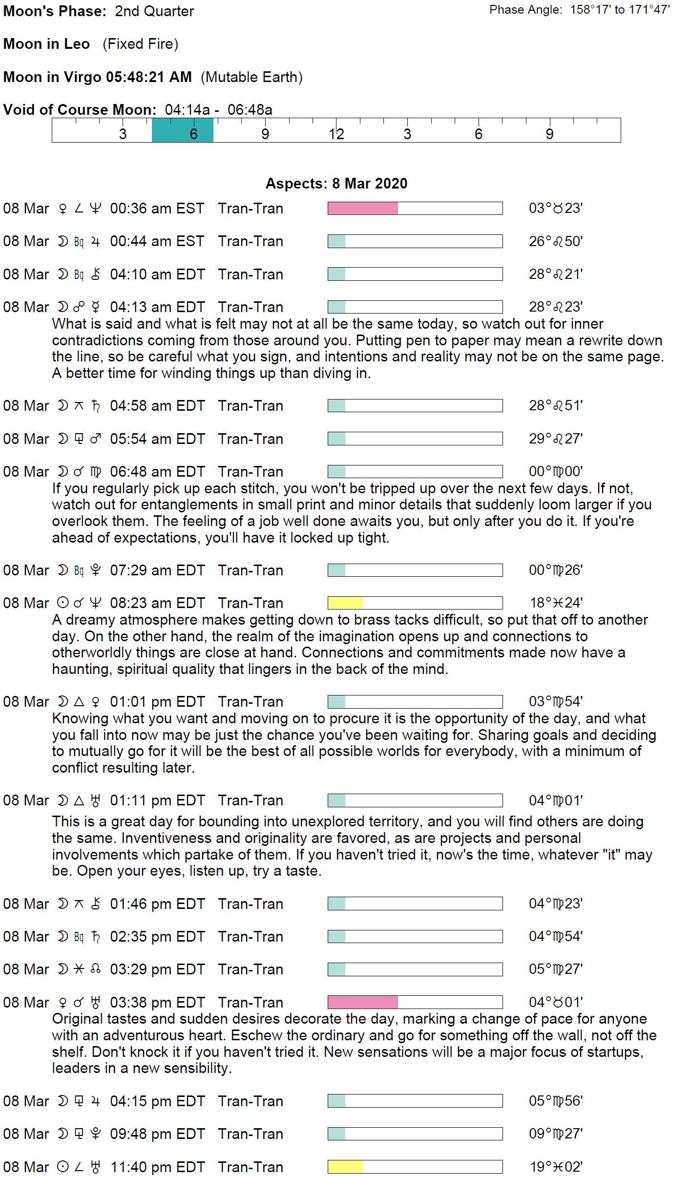 Planet Color Key: The longer the bar, the slower the aspecting planet and the longer the duration of the planet’s transit.
