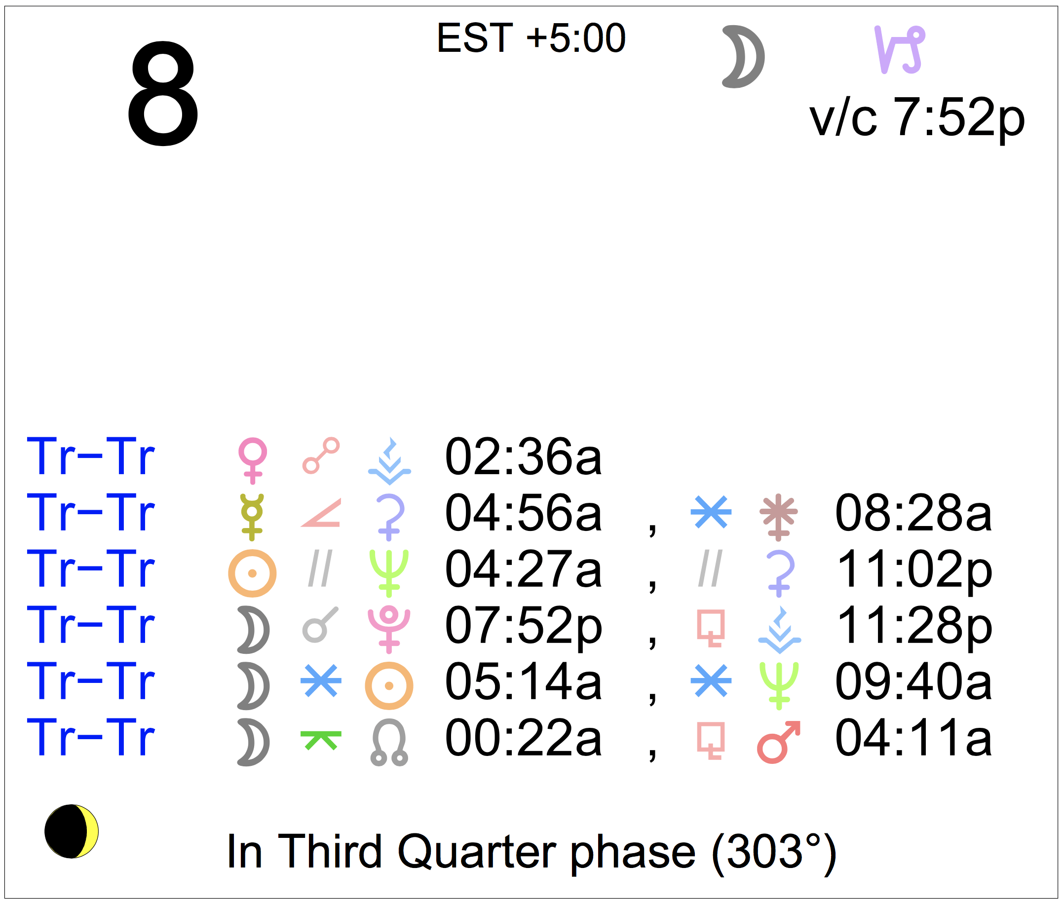 - A void Moon occurs from 7:52 PM forward (until tomorrow at 2:40 AM).