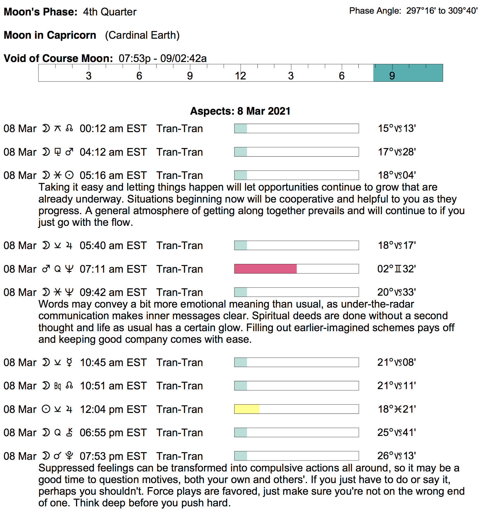 Planet Color Key: The longer the bar, the slower the aspecting planet, and the longer the duration of the planet’s transit.