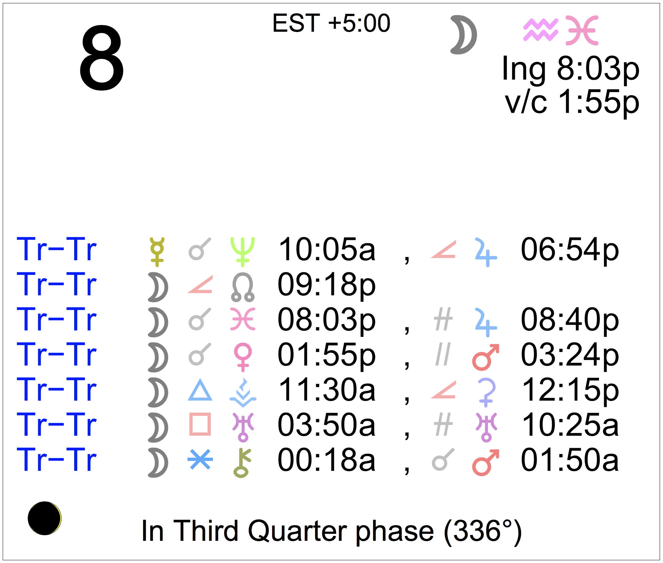 - The Moon is in Aquarius until 8:03 PM, after which the Moon is in Pisces.