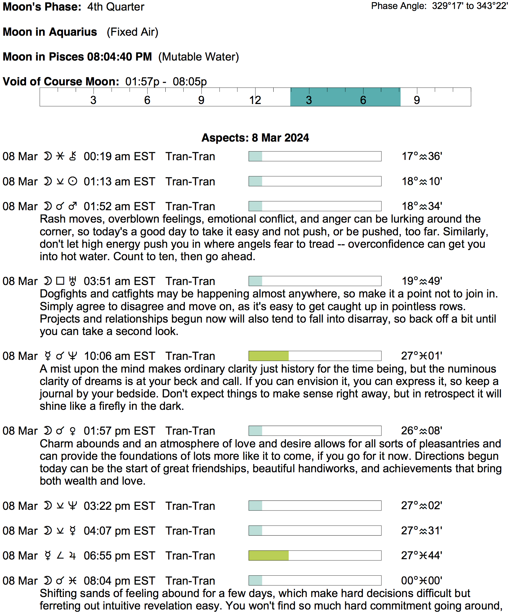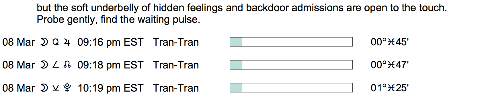 Planet Color Key: The longer the bar, the slower the aspecting planet, and the longer the duration of the planet’s transit.