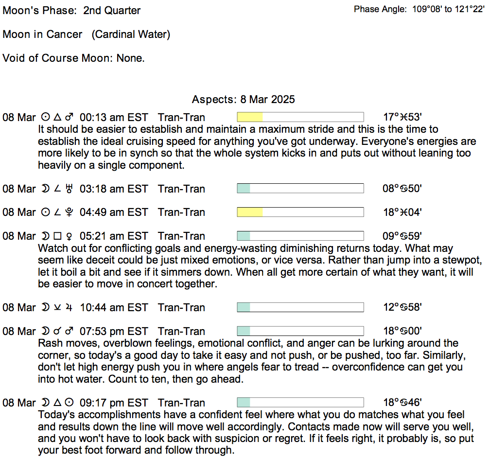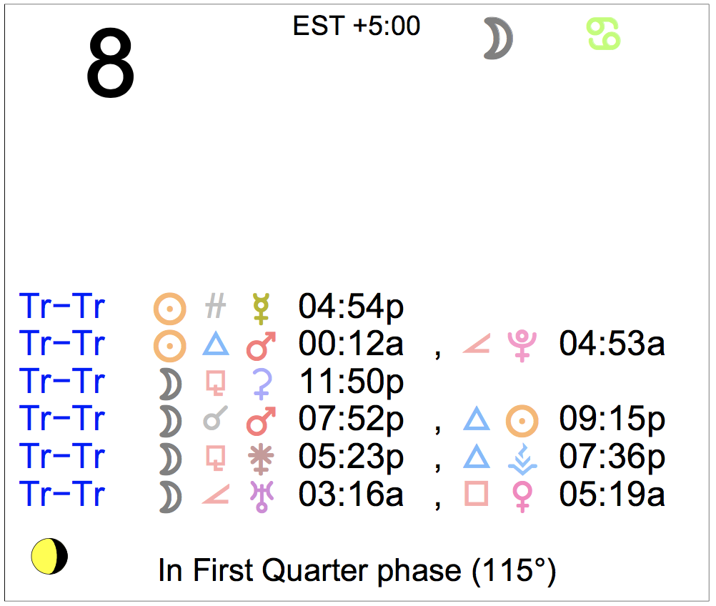 Planet Color Key: The longer the bar, the slower the aspecting planet, and the longer the duration of the planet’s transit.