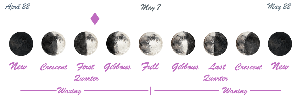 - The First Quarter Moon occurred yesterday, and the Full Moon will happen on May 7th.