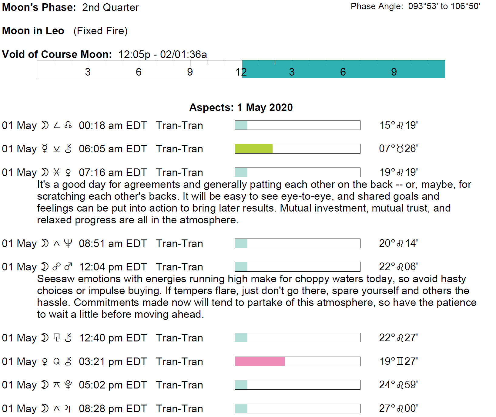 Planet Color Key: The longer the bar, the slower the aspecting planet and the longer the duration of the planet’s transit.