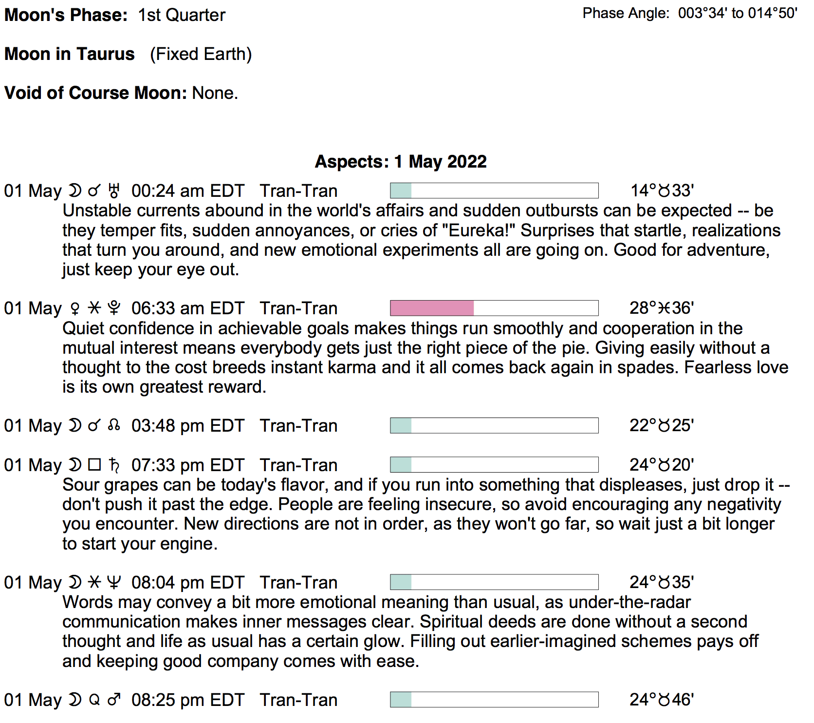 Planet Color Key: The longer the bar, the slower the aspecting planet, and the longer the duration of the planet’s transit.