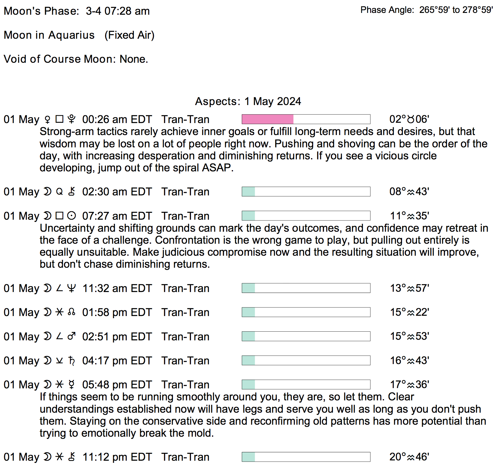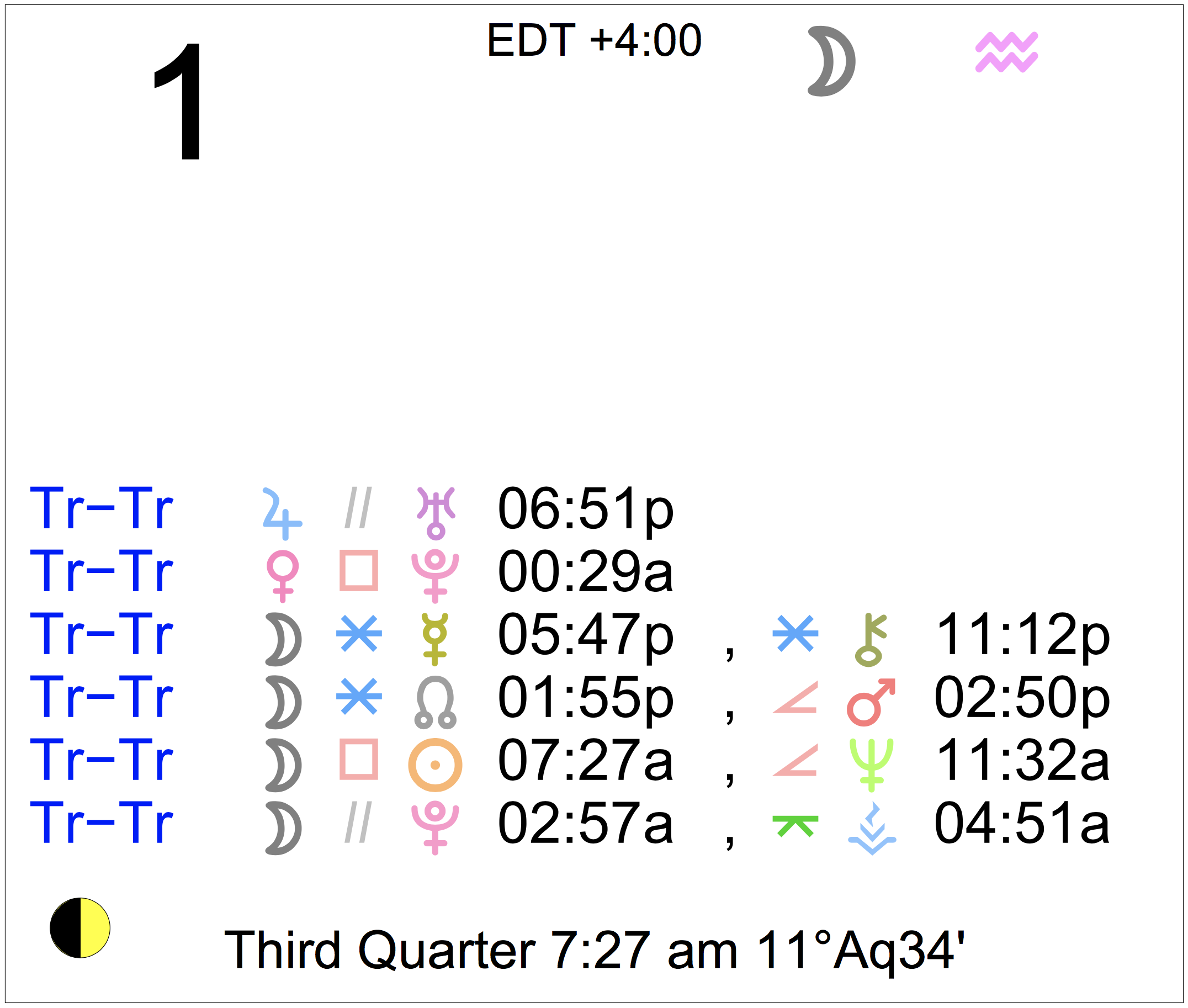 Planet Color Key: The longer the bar, the slower the aspecting planet, and the longer the duration of the planet’s transit.