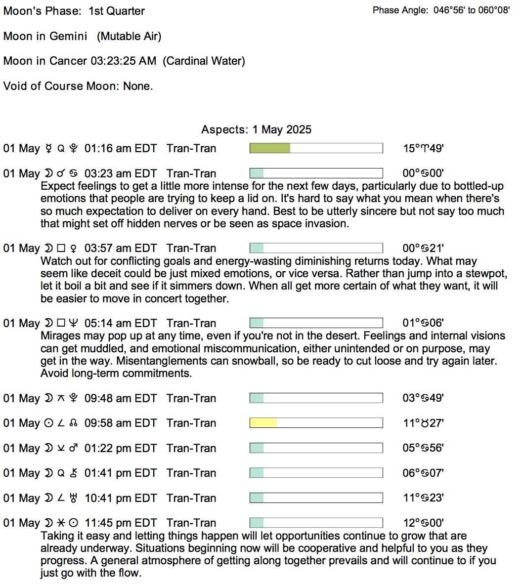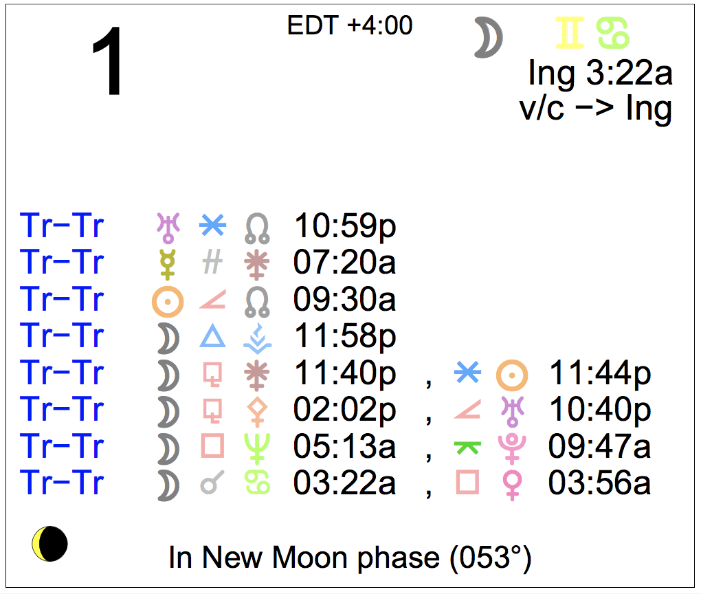 Planet Color Key: The longer the bar, the slower the aspecting planet, and the longer the duration of the planet’s transit.