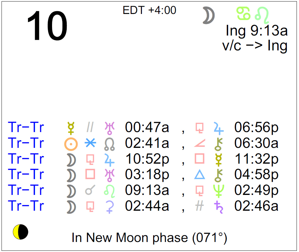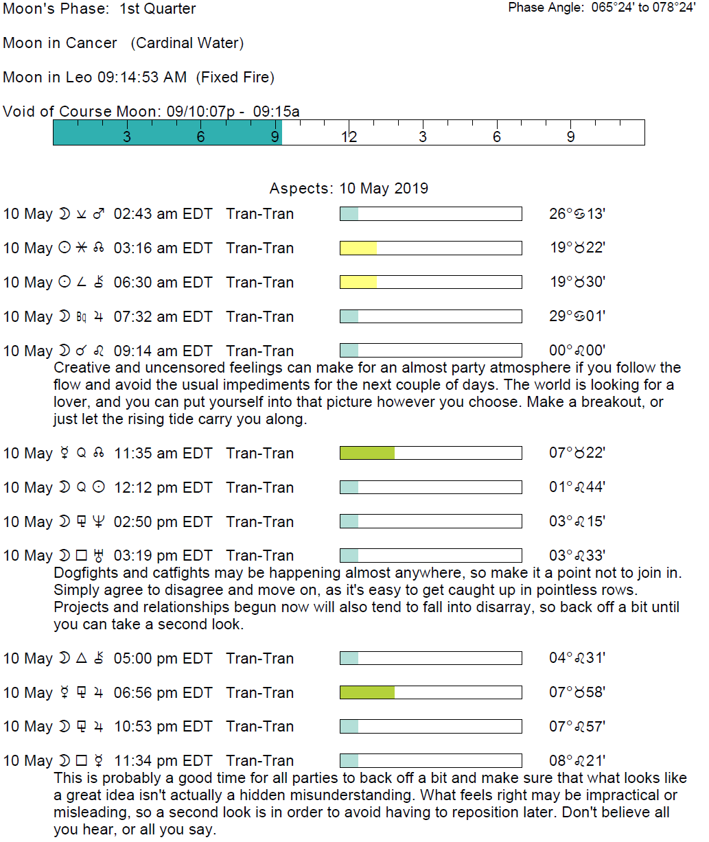 Planet Color Key: The longer the bar, the slower the aspecting planet and the longer the duration of the planet’s transit.