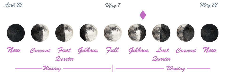 - The Full Moon occurred on the 7th, and the Last Quarter Moon will happen on May 14th.