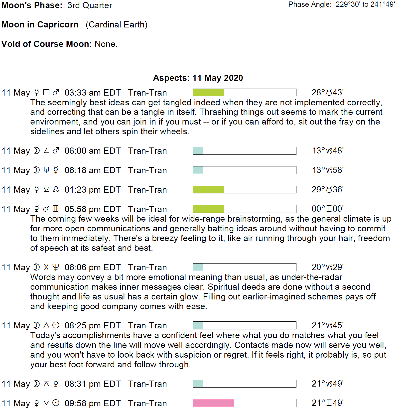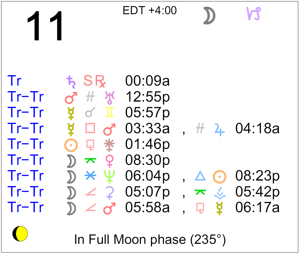 Planet Color Key: The longer the bar, the slower the aspecting planet and the longer the duration of the planet’s transit.