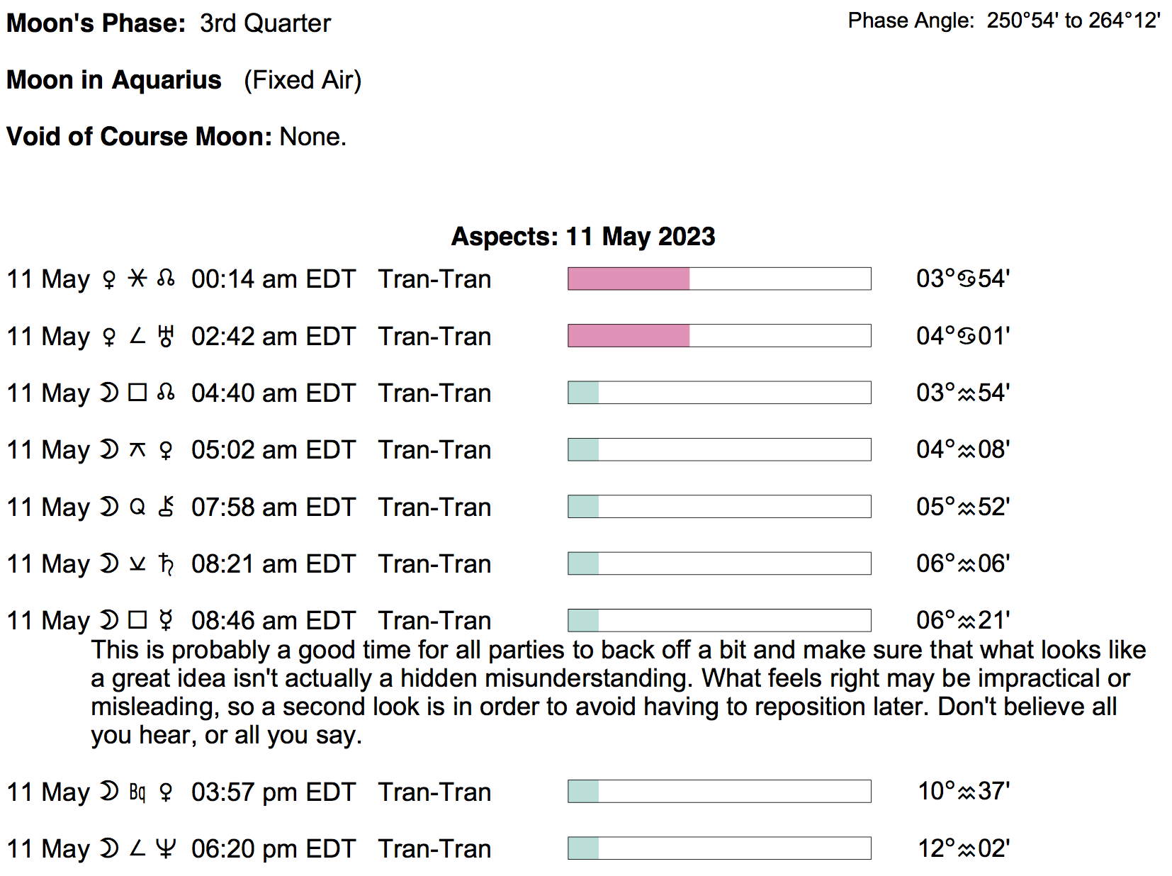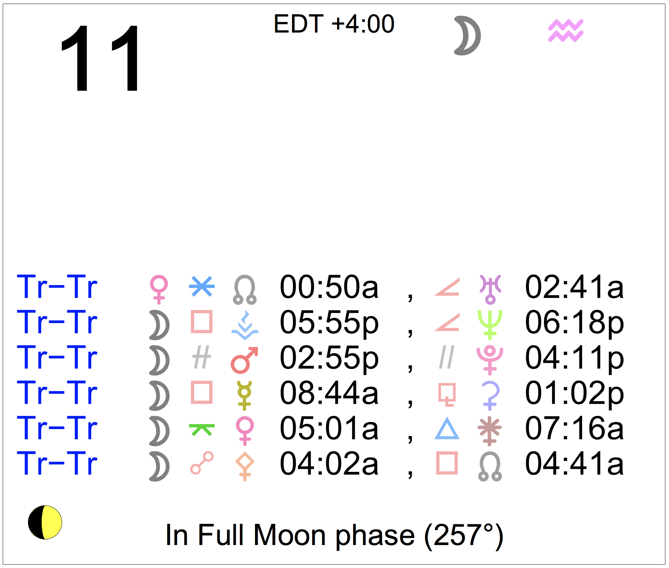 Planet Color Key: The longer the bar, the slower the aspecting planet, and the longer the duration of the planet’s transit.