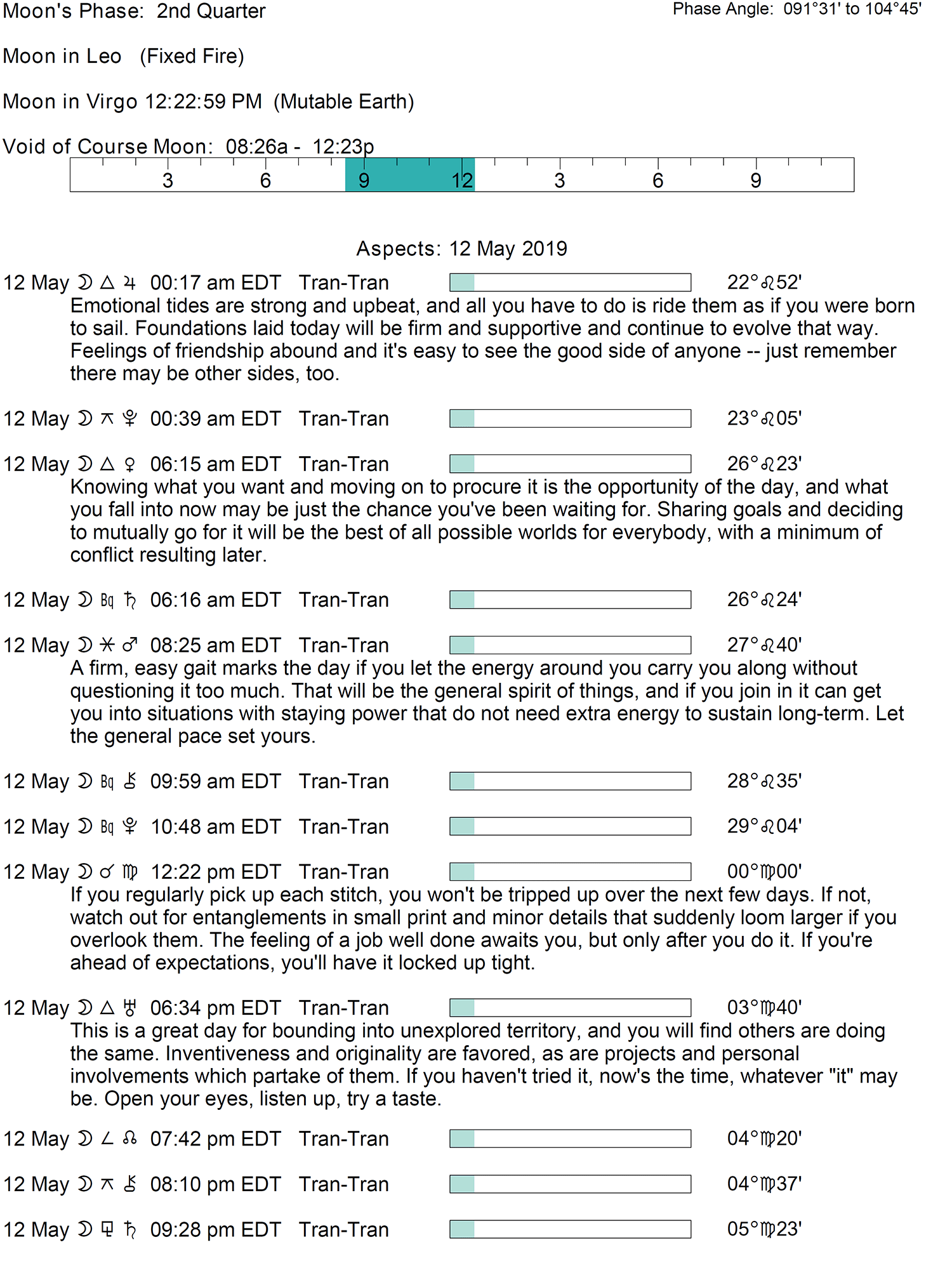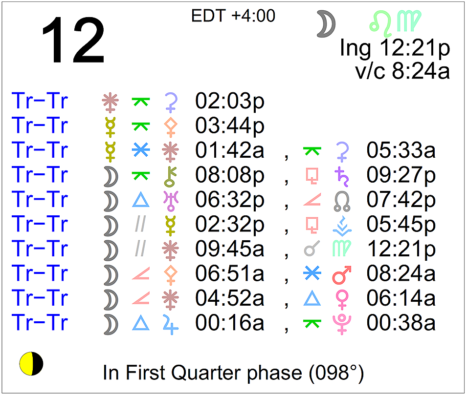 - The void Moon occurs from 8:24 AM until 12:21 PM.
