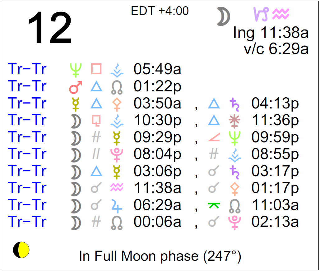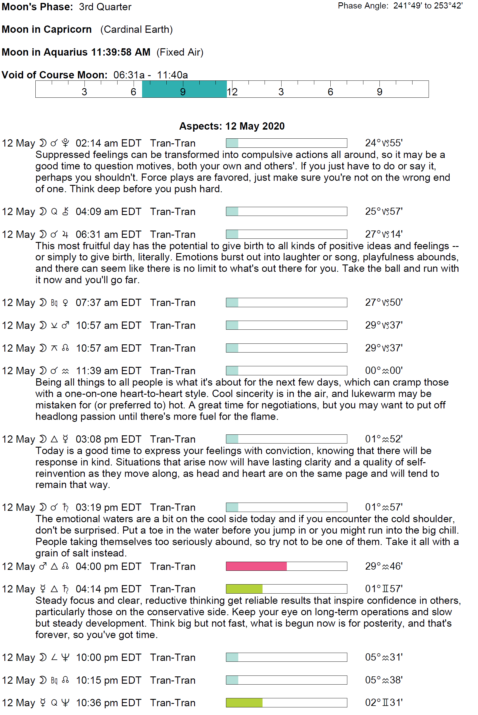 Planet Color Key: The longer the bar, the slower the aspecting planet and the longer the duration of the planet’s transit.