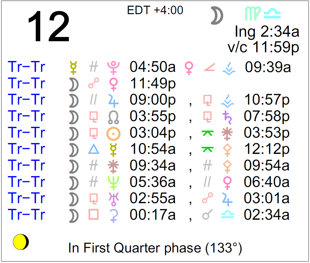 Planet Color Key: The longer the bar, the slower the aspecting planet, and the longer the duration of the planet’s transit.