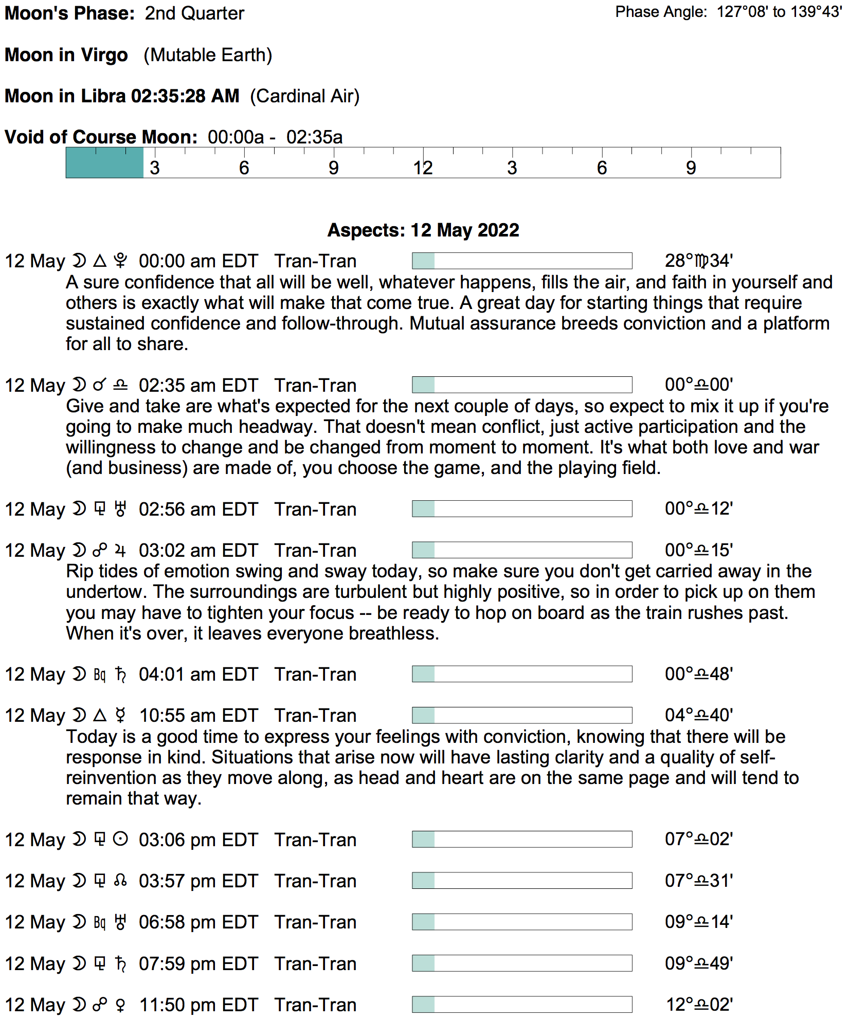 - A void Moon period continues today until 2:34 AM (since 11:59 AM last night).