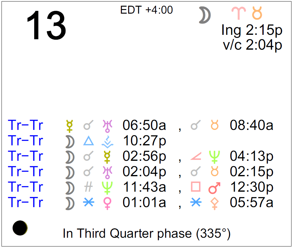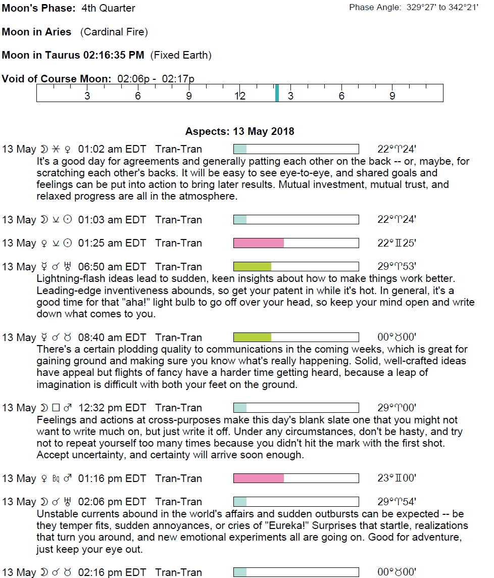 Planet Color Key: The longer the bar, the slower the aspecting planet and the longer the duration of the planet’s transit.