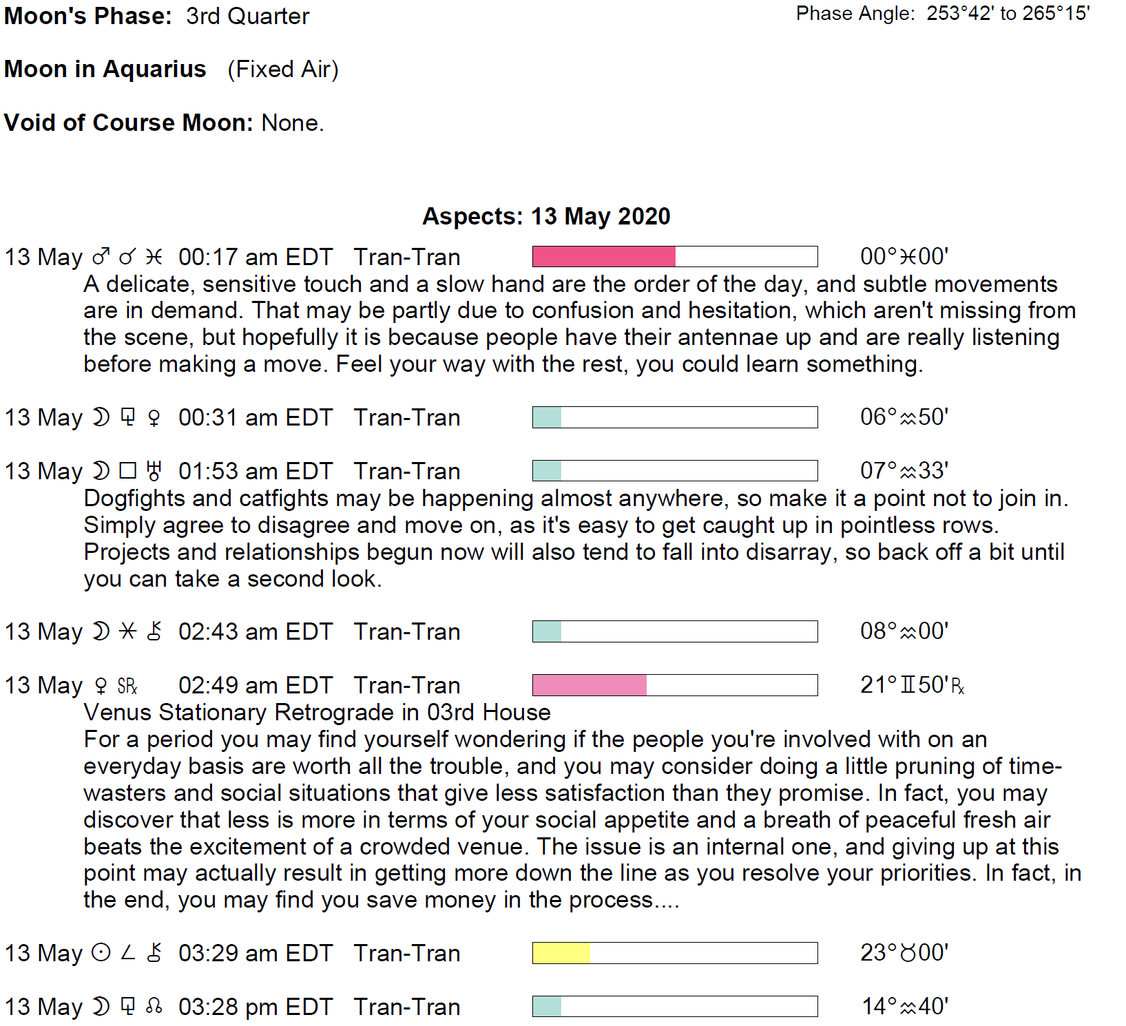Planet Color Key: The longer the bar, the slower the aspecting planet and the longer the duration of the planet’s transit.