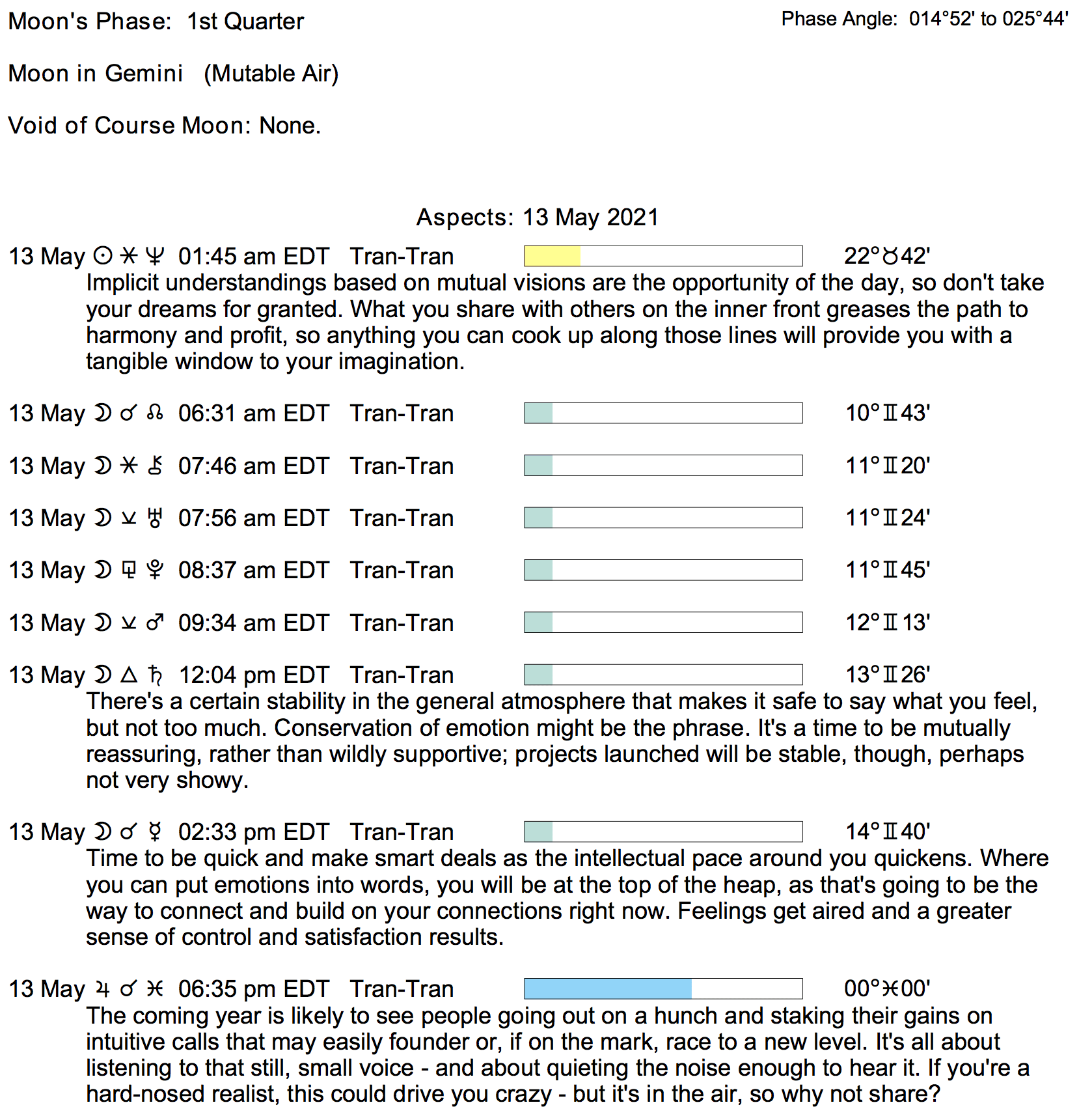 Planet Color Key: The longer the bar, the slower the aspecting planet, and the longer the duration of the planet’s transit.