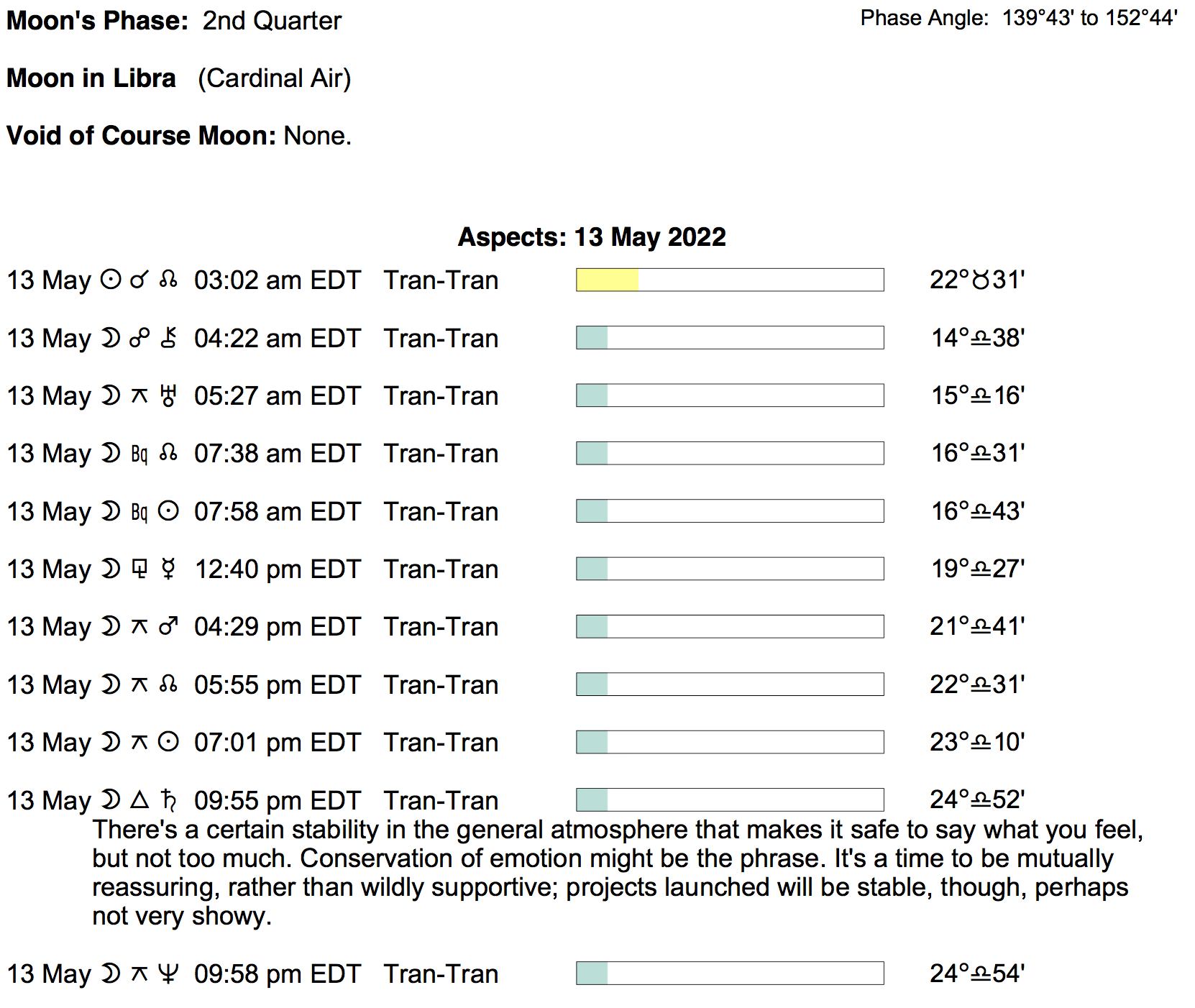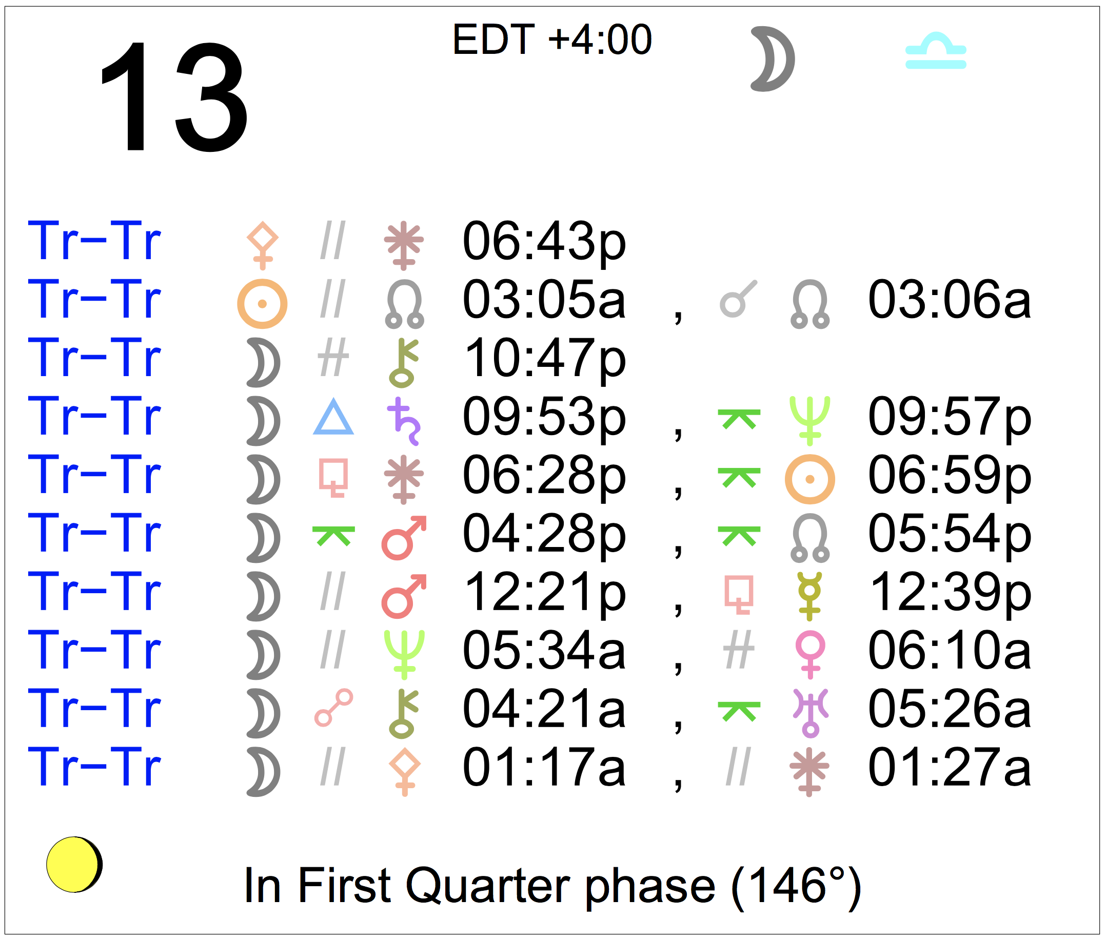 Planet Color Key: The longer the bar, the slower the aspecting planet, and the longer the duration of the planet’s transit.
