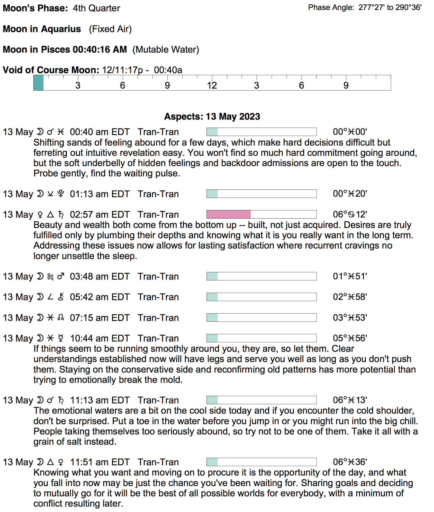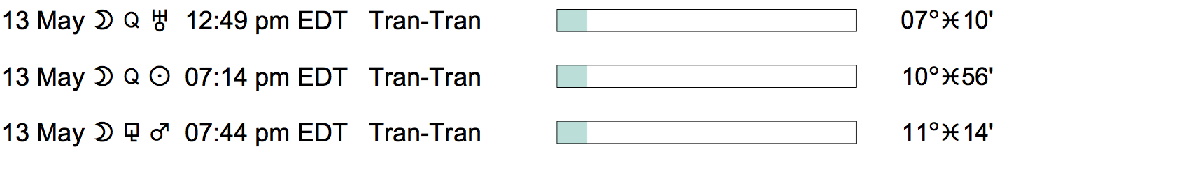 Planet Color Key: The longer the bar, the slower the aspecting planet, and the longer the duration of the planet’s transit.