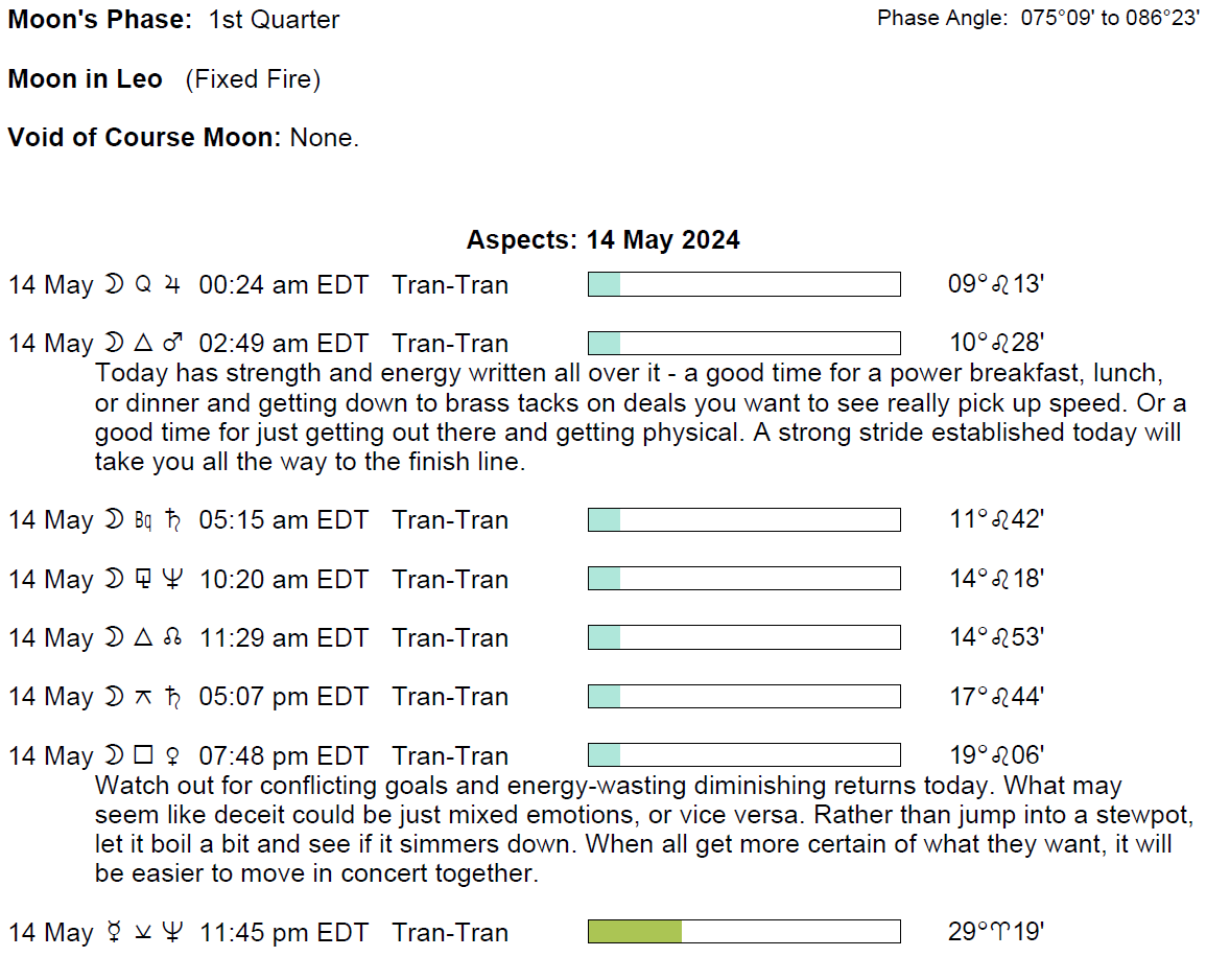 Planet Color Key: The longer the bar, the slower the aspecting planet, and the longer the duration of the planet’s transit.