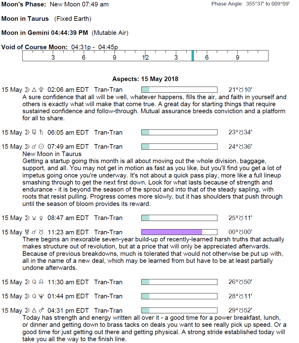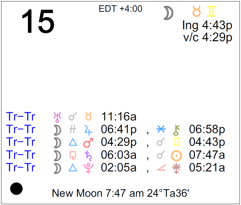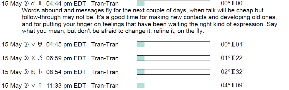 The following aspects (major only) and positions are at noon (EDT) on May 15th: