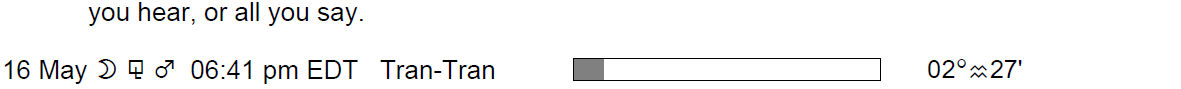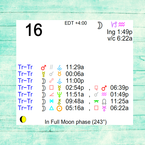 The following aspects (major only) and positions are at noon (EDT) on May 16th: