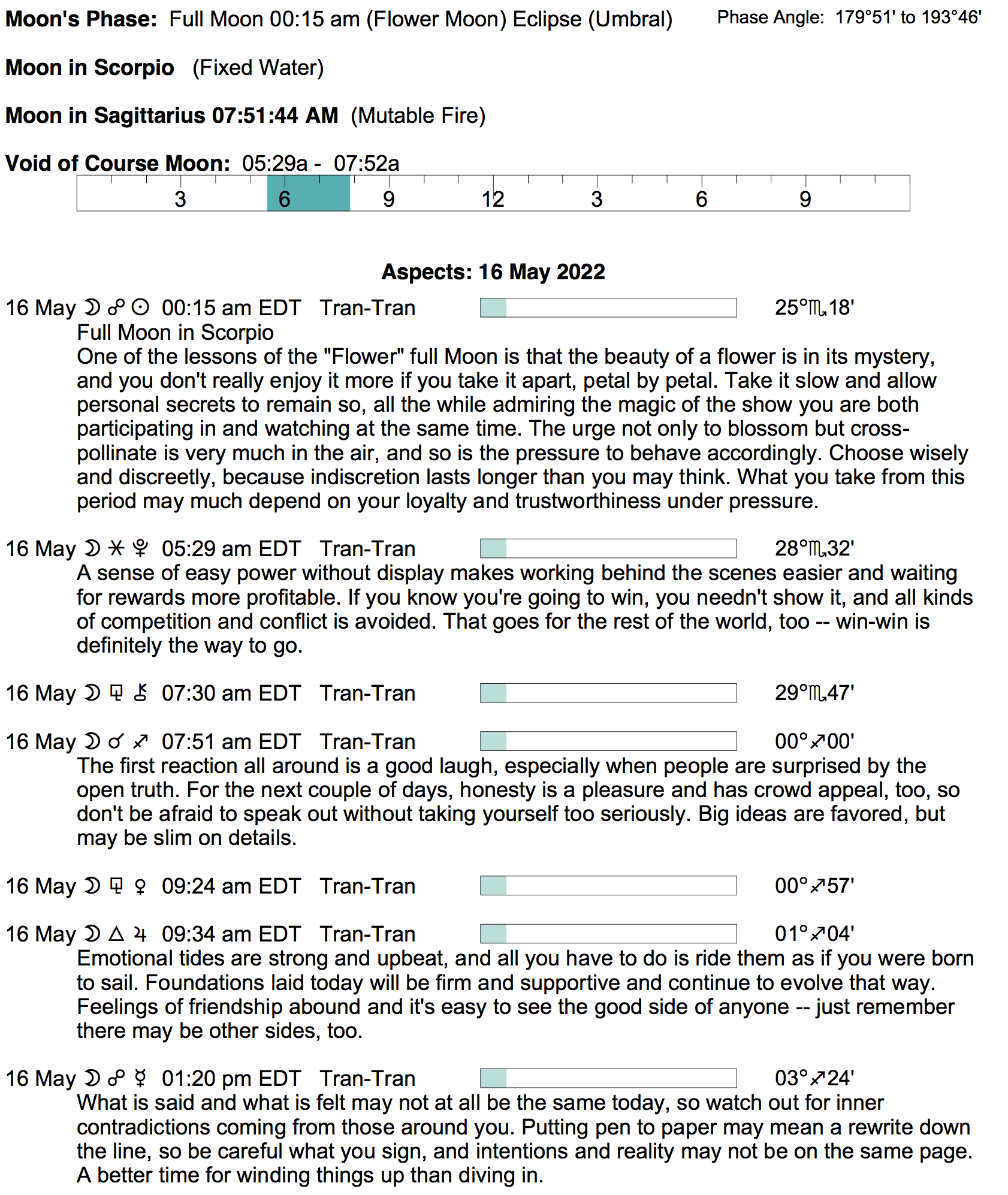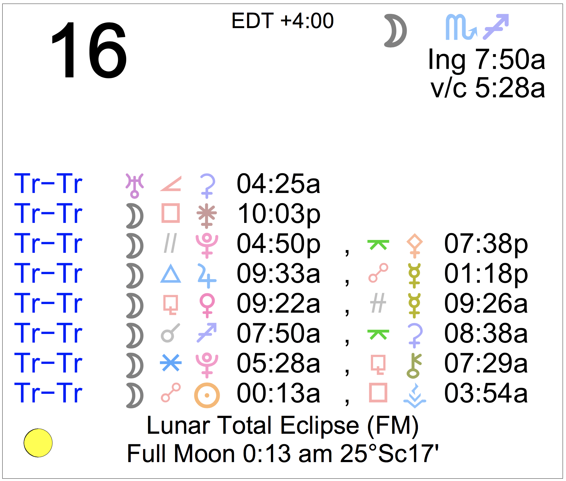- The Full Moon Lunar Eclipse occurs early today, at 12:13 AM EDT, in the sign of Scorpio.