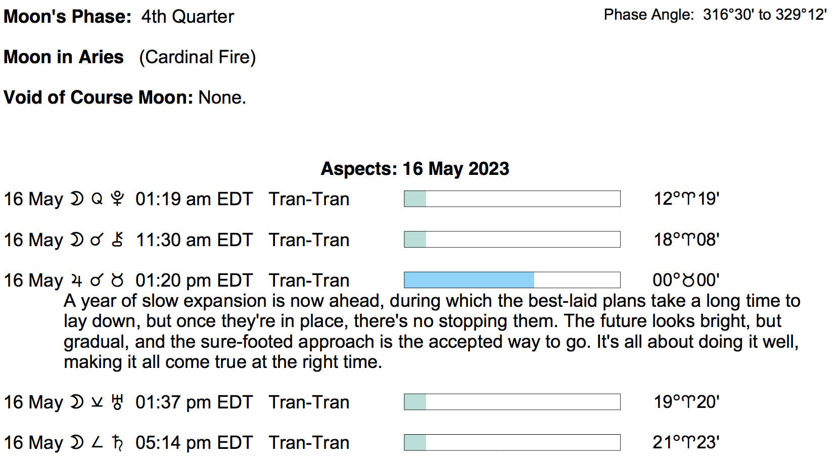 Planet Color Key: The longer the bar, the slower the aspecting planet, and the longer the duration of the planet’s transit.