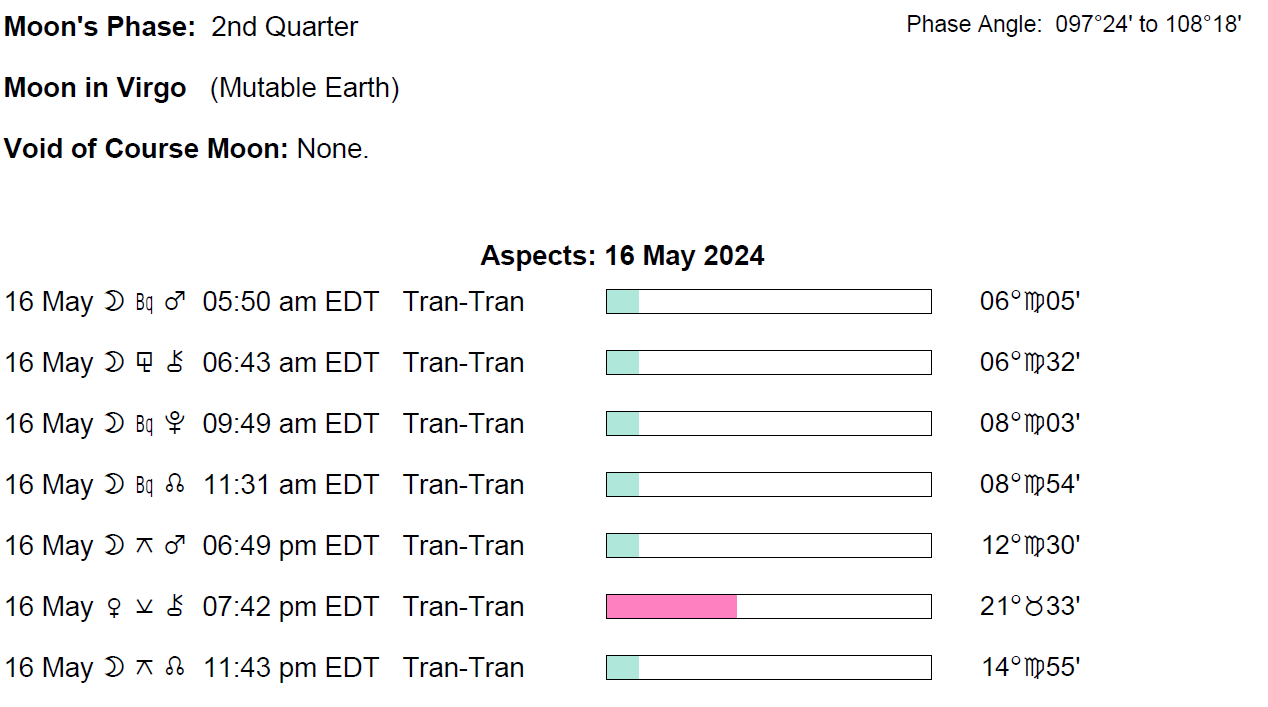 Planet Color Key: The longer the bar, the slower the aspecting planet, and the longer the duration of the planet’s transit.