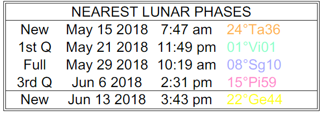 - The New Moon occurred on the 15th in the sign of Taurus, and the First Quarter Moon will occur on the 21st.