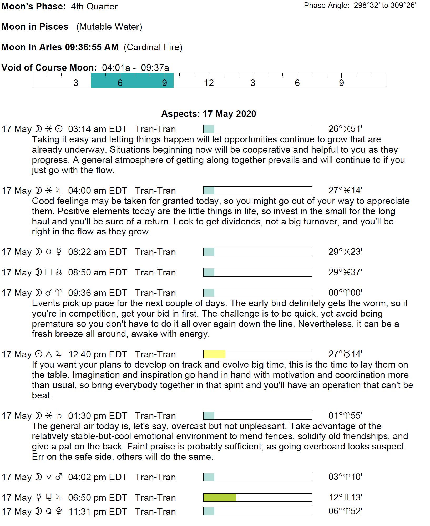 Planet Color Key: The longer the bar, the slower the aspecting planet and the longer the duration of the planet’s transit.
