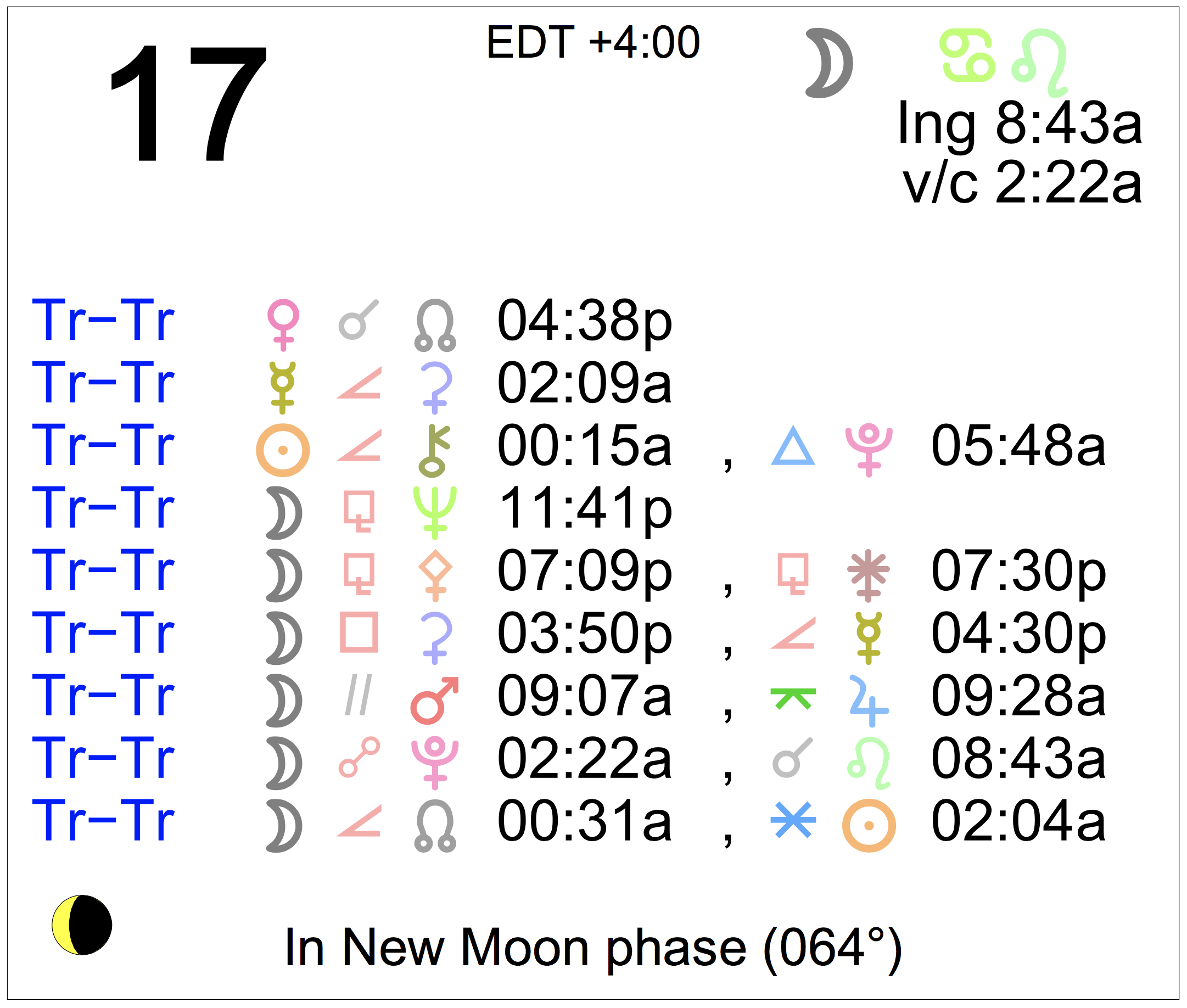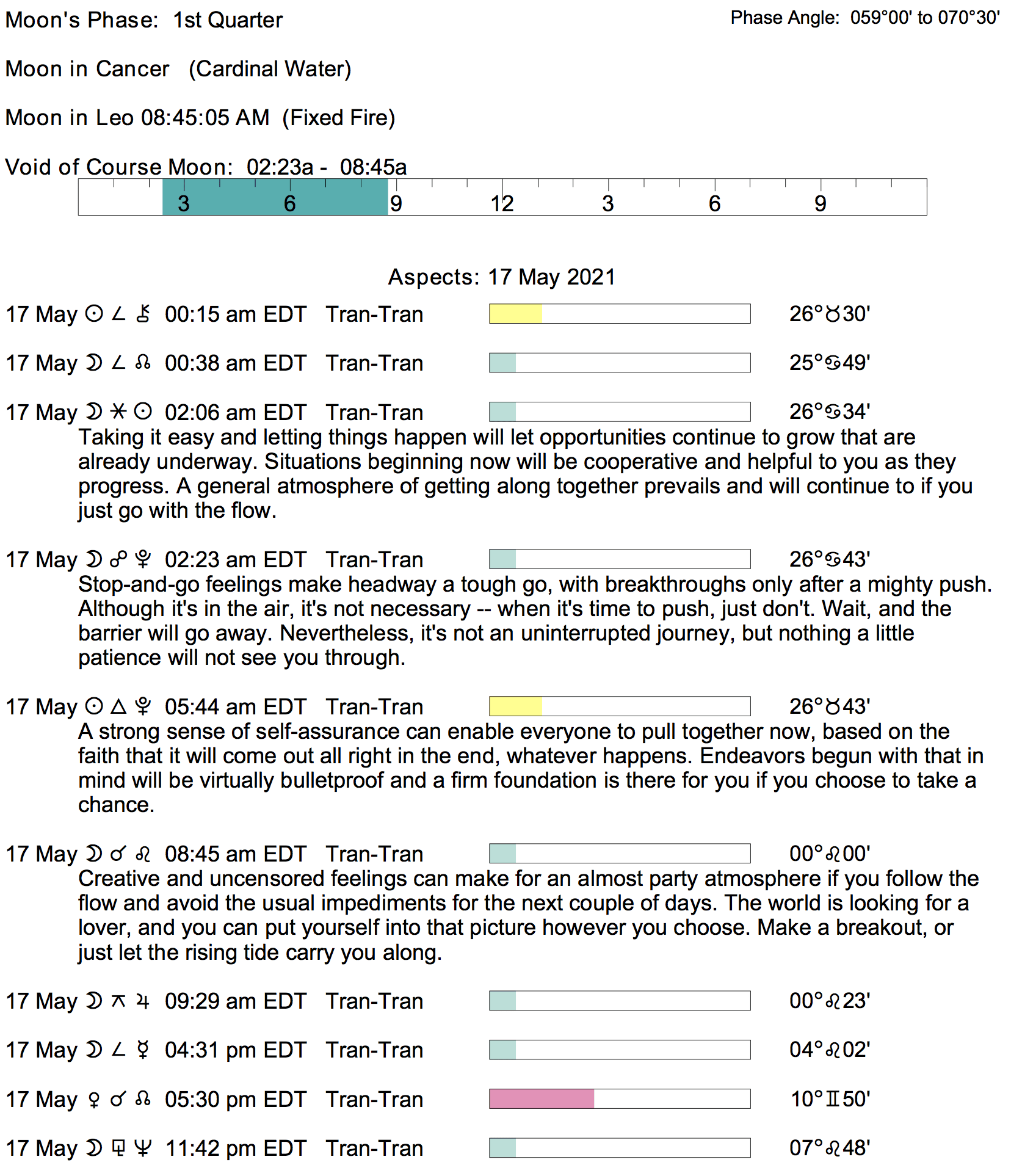 Planet Color Key: The longer the bar, the slower the aspecting planet, and the longer the duration of the planet’s transit.