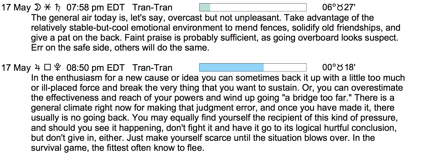 Planet Color Key: The longer the bar, the slower the aspecting planet, and the longer the duration of the planet’s transit.