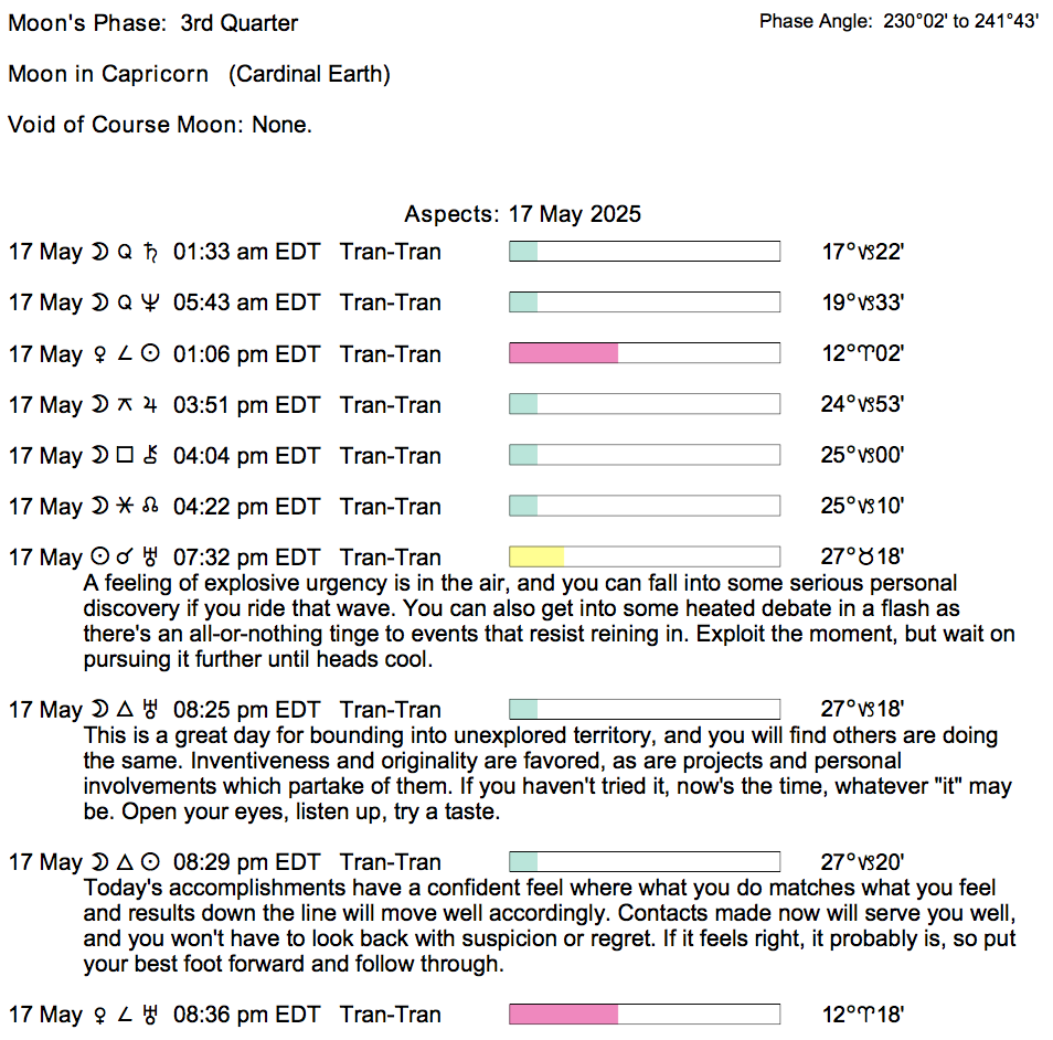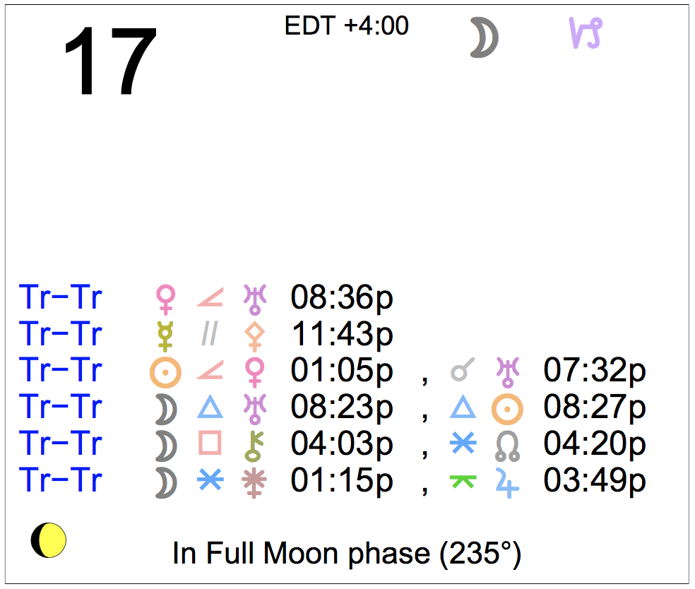 Planet Color Key: The longer the bar, the slower the aspecting planet, and the longer the duration of the planet’s transit.