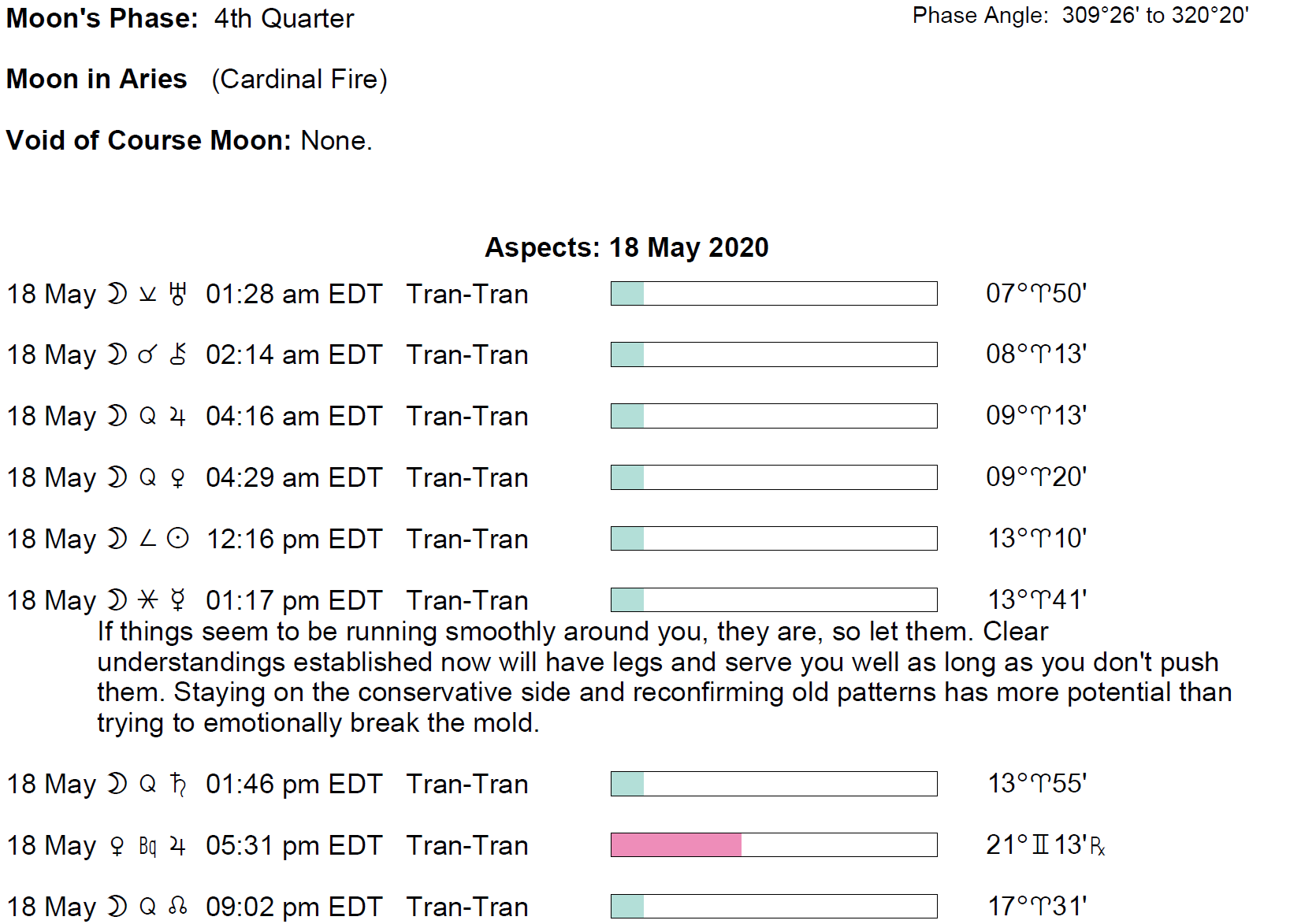 Planet Color Key: The longer the bar, the slower the aspecting planet and the longer the duration of the planet’s transit.